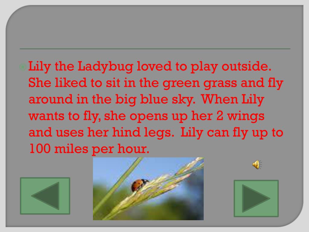Lily the Ladybug loved to play outside. She liked to sit in the green grass and fly around in the big blue sky. When Lily wants to fly, she opens up her 2 wings and uses her hind legs. Lily can fly up to 100 miles per hour.