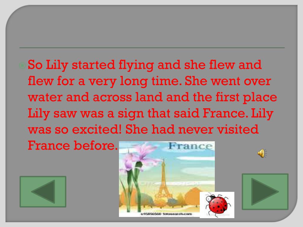 So Lily started flying and she flew and flew for a very long time. She went over water and across land and the first place Lily saw was a sign that said France. Lily was so excited! She had never visited France before.
