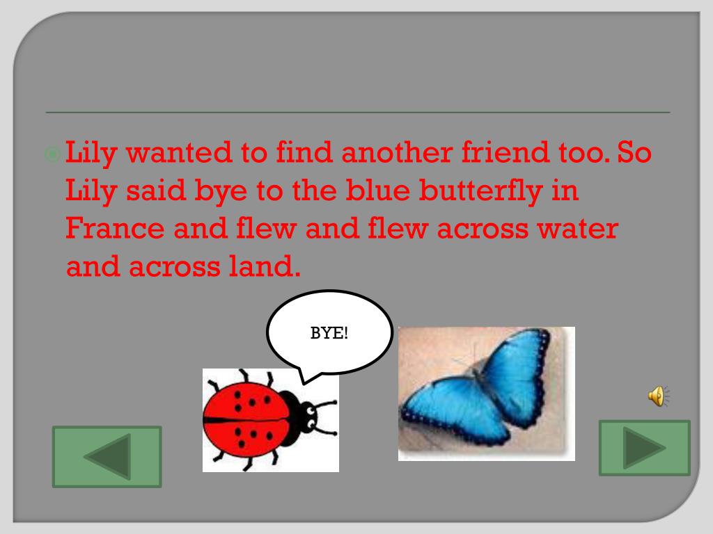 BYE! Lily wanted to find another friend too. So Lily said bye to the blue butterfly in France and flew and flew across water and across land.