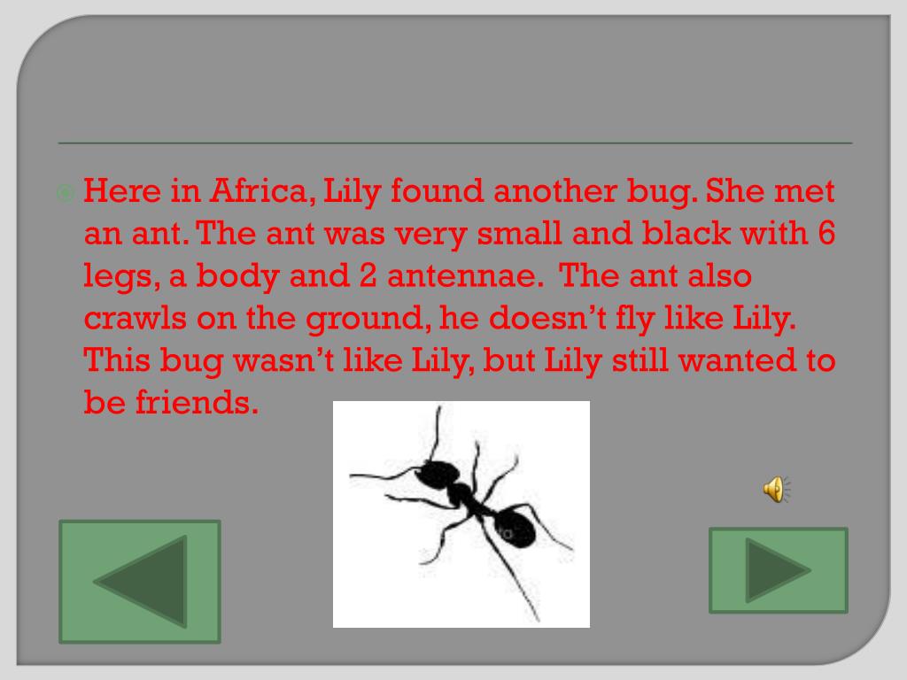 Here in Africa, Lily found another bug. She met an ant. The ant was very small and black with 6 legs, a body and 2 antennae. The ant also crawls on the ground, he doesn’t fly like Lily. This bug wasn’t like Lily, but Lily still wanted to be friends.