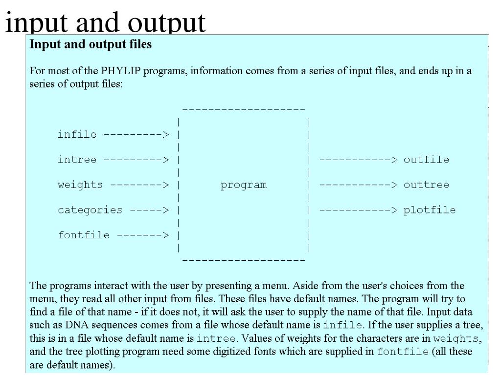 The Phylip Manual is an excellent source of information. Brief one line descriptions of the programs are here The easiest way to run PHYLIP programs is via a command line menu (similar to clustalw). The program is invoked through clicking on an icon, or by typing the program name at the command line. > seqboot > protpars > fitch If there is no file called infile the program responds with: [gogarten@carrot gogarten]$ seqboot seqboot: can't find input file "infile" Please enter a new file name>