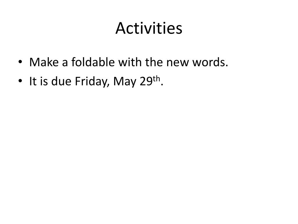 Activities • Make a foldable with the new words. • It is due Friday, May 29th.