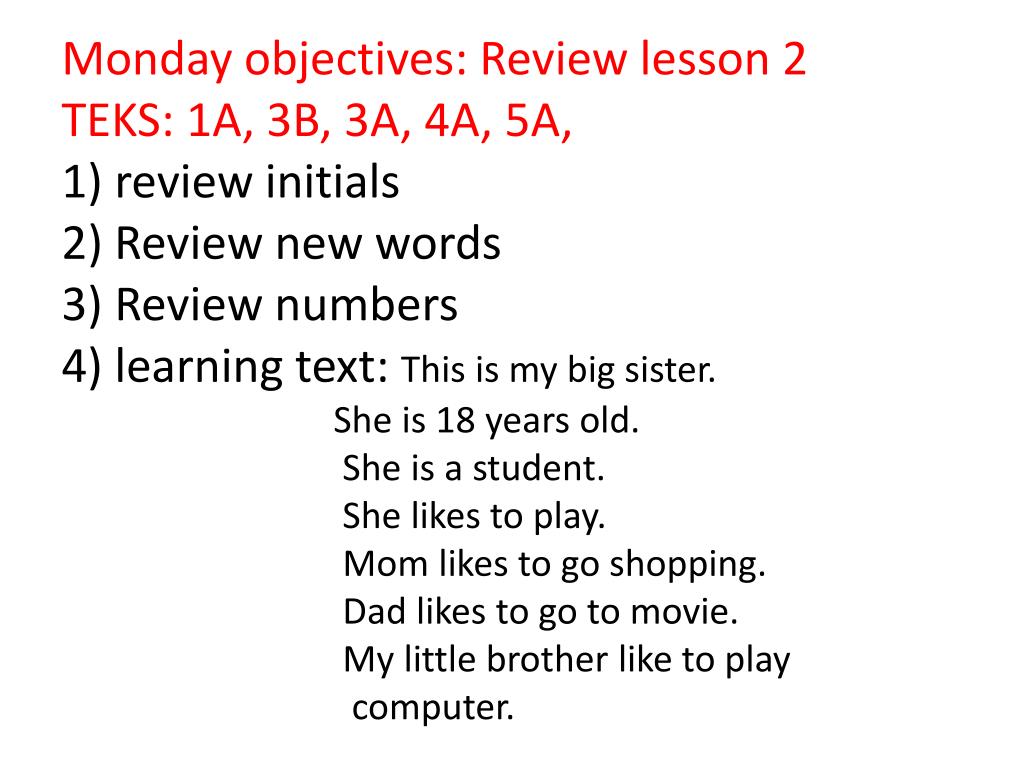 Monday objectives: Review lesson 2TEKS: 1A, 3B, 3A, 4A, 5A, 1) review initials2) Review new words3) Review numbers4) learning text: This is my big sister. She is 18 years old. She is a student. She likes to play. Mom likes to go shopping. Dad likes to go to movie. My little brother like to play computer.