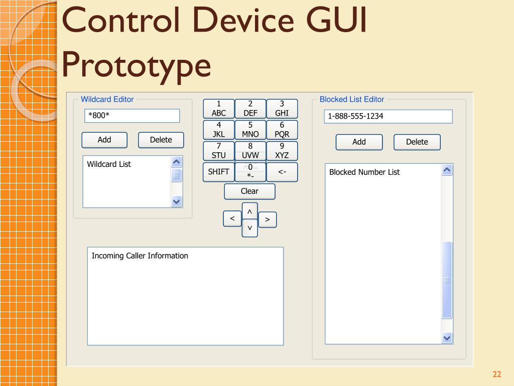 The Solution • A device that blocks incoming calls based on information in a database. • Allows extra customization such as blocking numbers at specified times and blocking whole area codes.