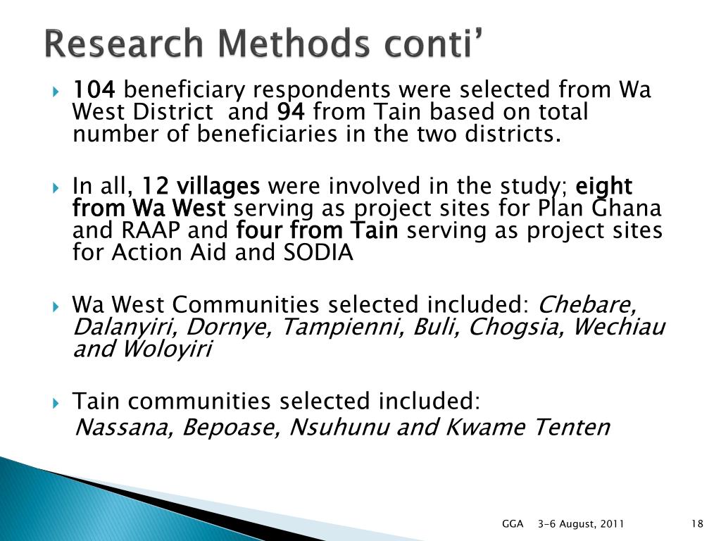 Research Methods conti’ • 104 beneficiary respondents were selected from Wa West District and 94 from Tain based on total number of beneficiaries in the two districts. • In all, 12 villages were involved in the study; eight from Wa West serving as project sites for Plan Ghana and RAAP and four from Tain serving as project sites for Action Aid and SODIA • Wa West Communities selected included: Chebare, Dalanyiri, Dornye, Tampienni, Buli, Chogsia, Wechiau and Woloyiri • Tain communities selected included: Nassana, Bepoase, Nsuhunu and KwameTenten GGA