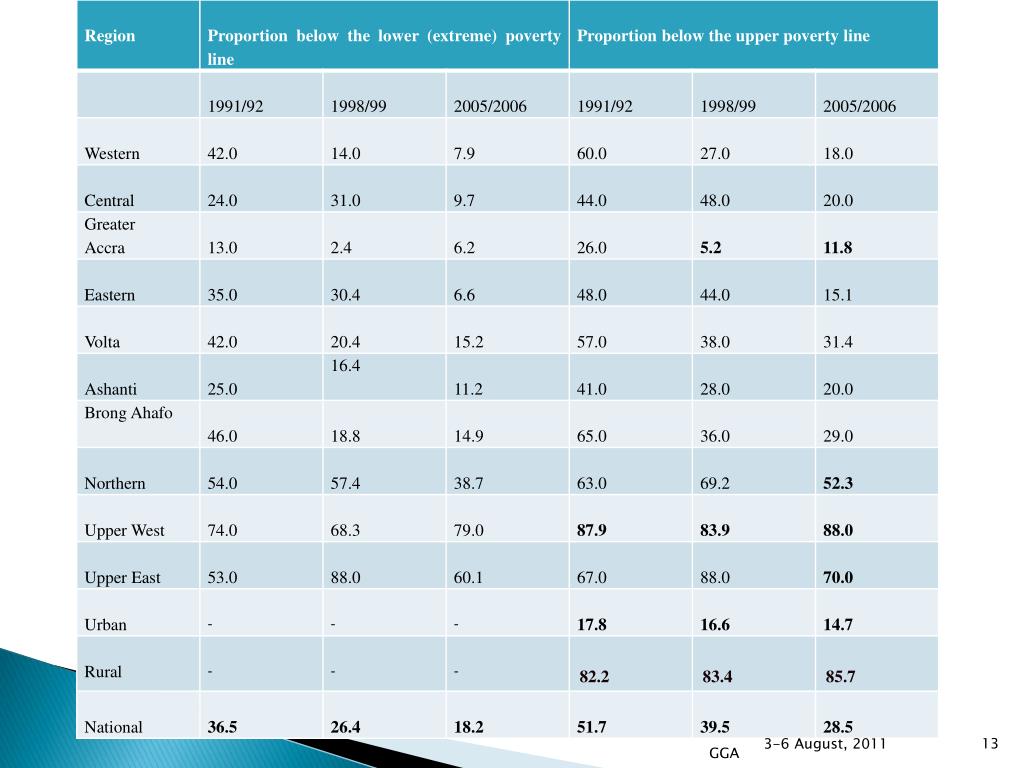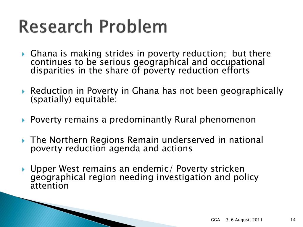 Research Problem • Ghana is making strides in poverty reduction; but there continues to be serious geographical and occupational disparities in the share of poverty reduction efforts • Reduction in Poverty in Ghana has not been geographically (spatially) equitable: • Poverty remains a predominantly Rural phenomenon • The Northern Regions Remain underserved in national poverty reduction agenda and actions • Upper West remains an endemic/ Poverty stricken geographical region needing investigation and policy attention GGA