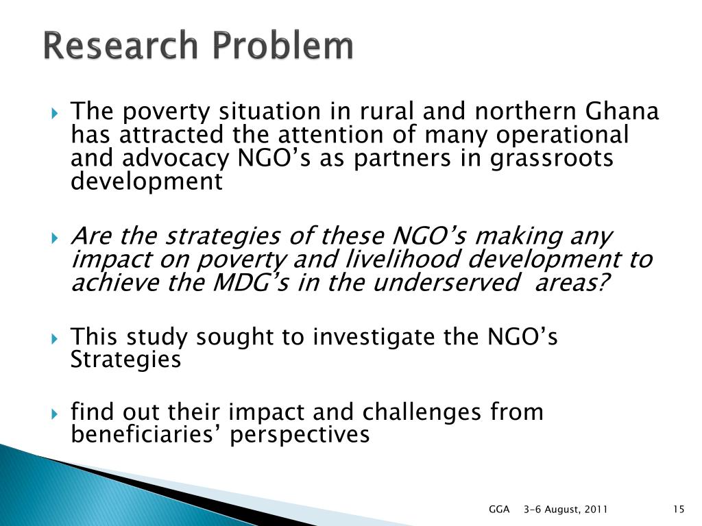 Research Problem • The poverty situation in rural and northern Ghana has attracted the attention of many operational and advocacy NGO’s as partners in grassroots development • Are the strategies of these NGO’s making any impact on poverty and livelihood development to achieve the MDG’s in the underserved areas? • This study sought to investigate the NGO’s Strategies • find out their impact and challenges from beneficiaries’ perspectives GGA