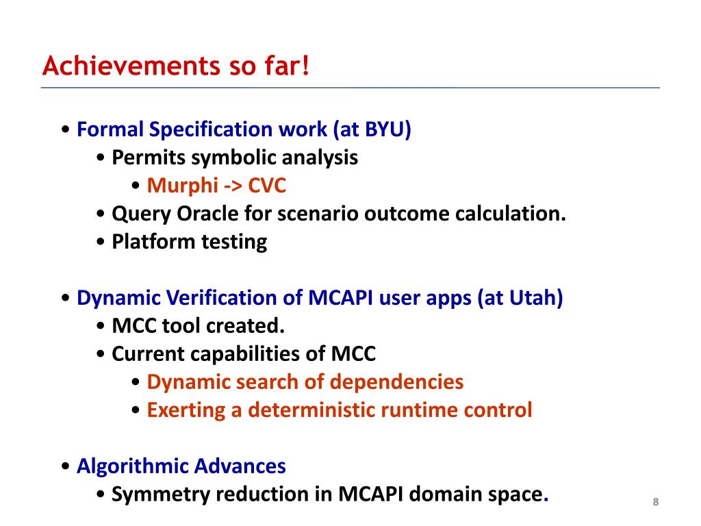 Achievements so far! • Formal Specification work (at BYU) • Permits symbolic analysis • Murphi -> CVC • Query Oracle for scenario outcome calculation. • Platform testing • Dynamic Verification of MCAPI user apps (at Utah) • MCC tool created. • Current capabilities of MCC • Dynamic search of dependencies • Exerting a deterministic runtime control • Algorithmic Advances • Symmetry reduction in MCAPI domain space.