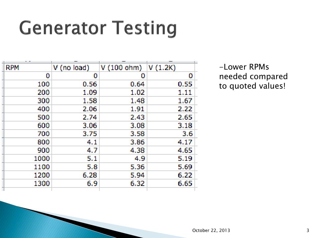 Generator Testing -Lower RPMs needed compared to quoted values! October 22, 2013