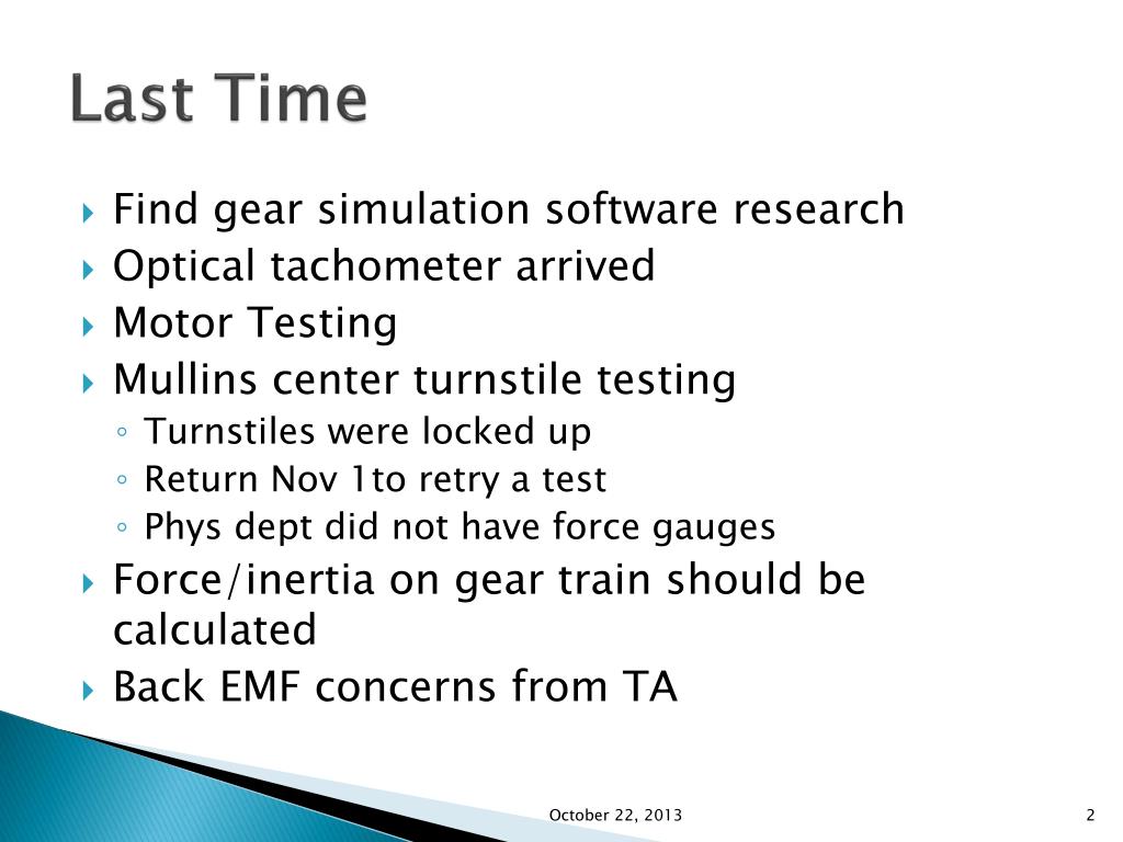 Last Time • Find gear simulation software research • Optical tachometer arrived • Motor Testing • Mullins center turnstile testing • Turnstiles were locked up • Return Nov 1to retry a test • Phys dept did not have force gauges • Force/inertia on gear train should be calculated • Back EMF concerns from TA October 22, 2013
