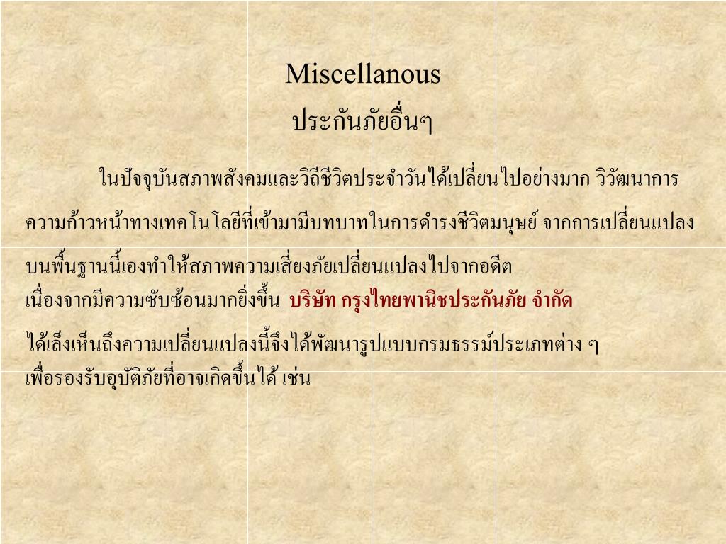 Miscellanousประกันภัยอื่นๆ ในปัจจุบันสภาพสังคมและวิถีชีวิตประจำวันได้เปลี่ยนไปอย่างมาก วิวัฒนาการ ความก้าวหน้าทางเทคโนโลยีที่เข้ามามีบทบาทในการดำรงชีวิตมนุษย์ จากการเปลี่ยนแปลง บนพื้นฐานนี้เองทำให้สภาพความเสี่ยงภัยเปลี่ยนแปลงไปจากอดีต เนื่องจากมีความซับซ้อนมากยิ่งขึ้นบริษัท กรุงไทยพานิชประกันภัย จำกัด ได้เล็งเห็นถึงความเปลี่ยนแปลงนี้จึงได้พัฒนารูปแบบกรมธรรม์ประเภทต่าง ๆ เพื่อรองรับอุบัติภัยที่อาจเกิดขึ้นได้ เช่น