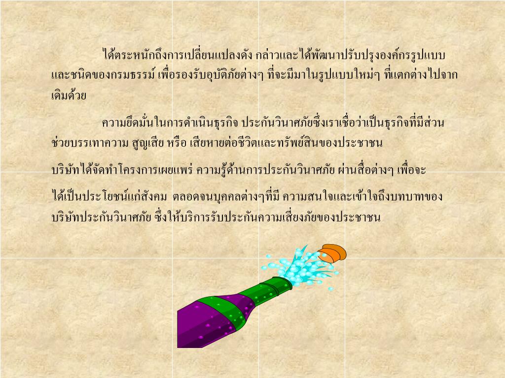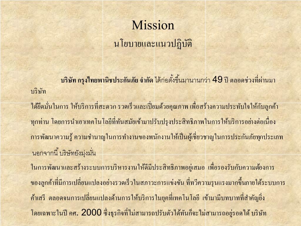 MissionนโยบายและแนวปฏิบัติMissionนโยบายและแนวปฏิบัติ บริษัท กรุงไทยพานิชประกันภัย จำกัด ได้ก่อตั้งขึ้นมานานกว่า 49 ปี ตลอดช่วงที่ผ่านมาบริษัท ได้ยึดมั่นในการ ให้บริการที่สะดวก รวดเร็วและเปี่ยมด้วยคุณภาพ เพื่อสร้างความประทับใจให้กับลูกค้า ทุกท่าน โดยการนำเอาเทคโนโลยีที่ทันสมัยเข้ามาปรับปรุงประสิทธิภาพในการให้บริการอย่างต่อเนื่อง การพัฒนาความรู้ ความชำนาญในการทำงานของพนักงานให้เป็นผู้เชี่ยวชาญในการประกันภัยทุกประเภท นอกจากนี้ บริษัทยังมุ่งมั่น ในการพัฒนาและสร้างระบบการบริหารงานให้ดีมีประสิทธิภาพอยู่เสมอ เพื่อรองรับกับความต้องการ ของลูกค้าที่มีการเปลี่ยนแปลงอย่างรวดเร็วในสภาวะการแข่งขัน ที่ทวีความรุนแรงมากขึ้นภายใต้ระบบการ ค้าเสรี ตลอดจนการเปลี่ยนแปลงด้านการให้บริการในยุคที่เทคโนโลยี เข้ามามีบทบาทที่สำคัญยิ่ง โดยเฉพาะในปี คศ. 2000 ซึ่งธุรกิจที่ไม่สามารถปรับตัวได้ทันก็จะไม่สามารถอยู่รอดได้ บริษัท