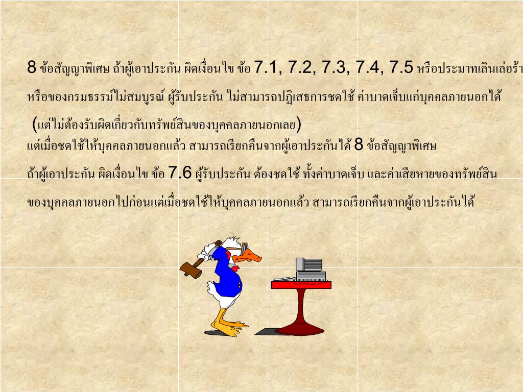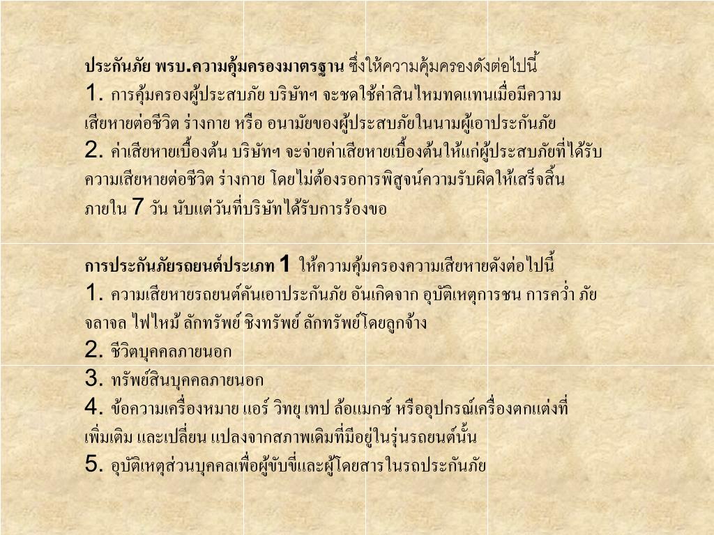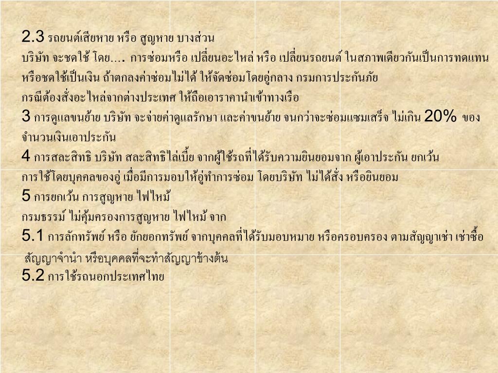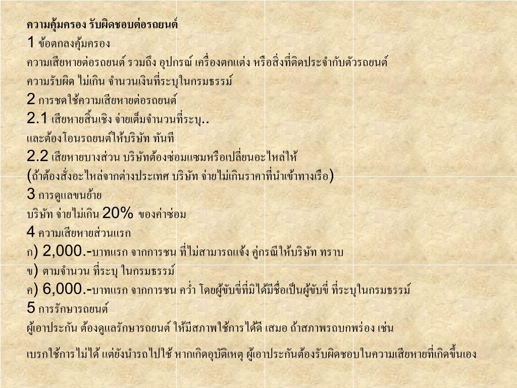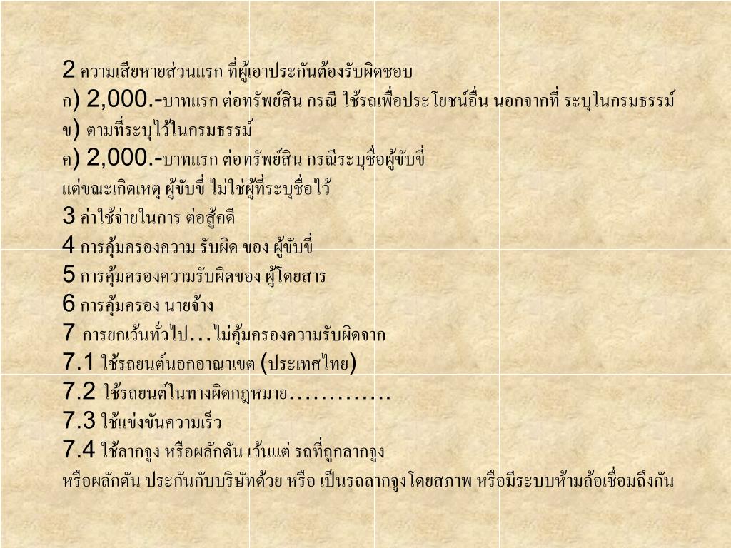2 ความเสียหายส่วนแรก ที่ผู้เอาประกันต้องรับผิดชอบก) 2,000.-บาทแรก ต่อทรัพย์สิน กรณี ใช้รถเพื่อประโยชน์อื่น นอกจากที่ ระบุในกรมธรรม์ ข) ตามที่ระบุไว้ในกรมธรรม์ค) 2,000.-บาทแรก ต่อทรัพย์สิน กรณีระบุชื่อผู้ขับขี่ แต่ขณะเกิดเหตุ ผู้ขับขี่ ไม่ใช่ผู้ที่ระบุชื่อไว้ 3 ค่าใช้จ่ายในการ ต่อสู้คดี4 การคุ้มครองความ รับผิด ของ ผู้ขับขี่5 การคุ้มครองความรับผิดของ ผู้โดยสาร6 การคุ้มครอง นายจ้าง 7 การยกเว้นทั่วไป…ไม่คุ้มครองความรับผิดจาก7.1 ใช้รถยนต์นอกอาณาเขต (ประเทศไทย)7.2 ใช้รถยนต์ในทางผิดกฎหมาย………….7.3 ใช้แข่งขันความเร็ว7.4 ใช้ลากจูง หรือผลักดัน เว้นแต่ รถที่ถูกลากจูงหรือผลักดัน ประกันกับบริษัทด้วย หรือ เป็นรถลากจูงโดยสภาพ หรือมีระบบห้ามล้อเชื่อมถึงกัน