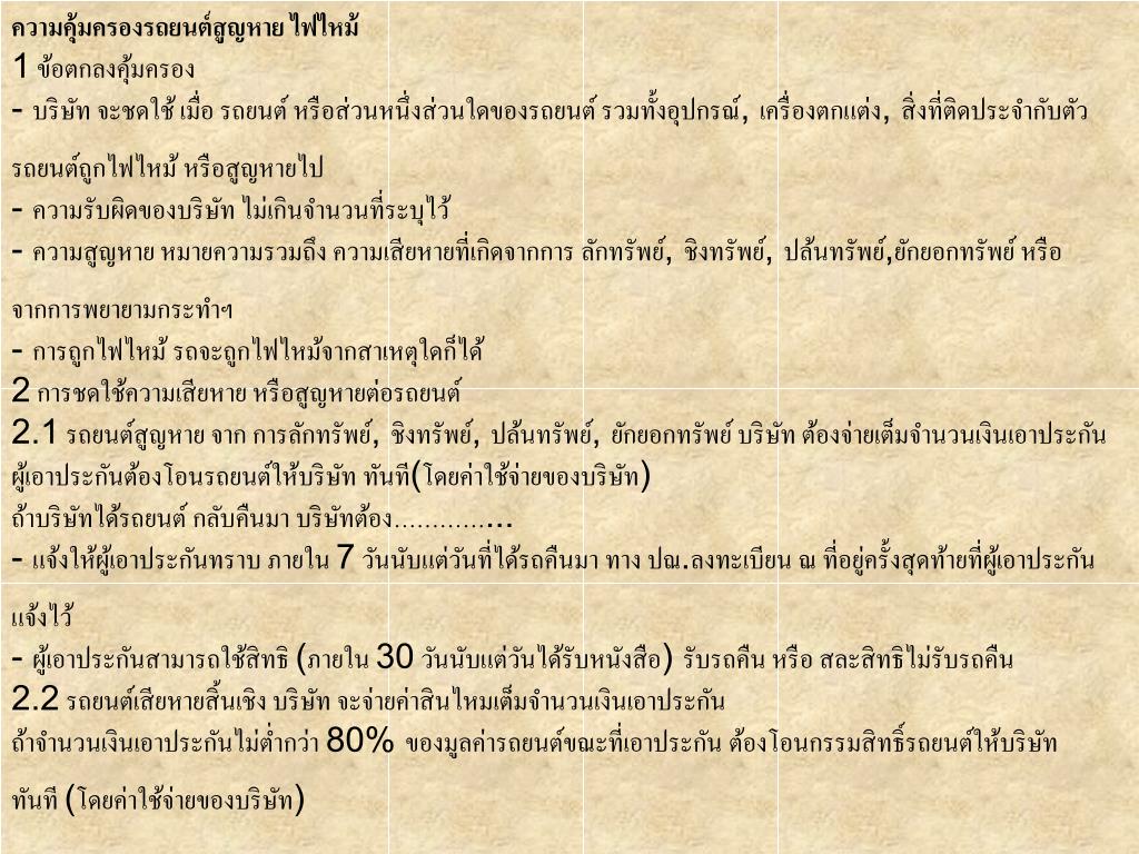 ความคุ้มครองรถยนต์สูญหาย ไฟไหม้1 ข้อตกลงคุ้มครอง- บริษัท จะชดใช้ เมื่อ รถยนต์ หรือส่วนหนึ่งส่วนใดของรถยนต์ รวมทั้งอุปกรณ์, เครื่องตกแต่ง, สิ่งที่ติดประจำกับตัว รถยนต์ถูกไฟไหม้ หรือสูญหายไป - ความรับผิดของบริษัท ไม่เกินจำนวนที่ระบุไว้- ความสูญหาย หมายความรวมถึง ความเสียหายที่เกิดจากการ ลักทรัพย์, ชิงทรัพย์, ปล้นทรัพย์,ยักยอกทรัพย์ หรือ จากการพยายามกระทำฯ- การถูกไฟไหม้ รถจะถูกไฟไหม้จากสาเหตุใดก็ได้ 2 การชดใช้ความเสียหาย หรือสูญหายต่อรถยนต์2.1 รถยนต์สูญหาย จาก การลักทรัพย์, ชิงทรัพย์, ปล้นทรัพย์, ยักยอกทรัพย์ บริษัท ต้องจ่ายเต็มจำนวนเงินเอาประกัน ผู้เอาประกันต้องโอนรถยนต์ให้บริษัท ทันที(โดยค่าใช้จ่ายของบริษัท) ถ้าบริษัทได้รถยนต์ กลับคืนมา บริษัทต้อง…………...- แจ้งให้ผู้เอาประกันทราบ ภายใน 7 วันนับแต่วันที่ได้รถคืนมา ทาง ปณ.ลงทะเบียน ณ ที่อยู่ครั้งสุดท้ายที่ผู้เอาประกัน แจ้งไว้- ผู้เอาประกันสามารถใช้สิทธิ (ภายใน 30 วันนับแต่วันได้รับหนังสือ) รับรถคืน หรือ สละสิทธิไม่รับรถคืน 2.2 รถยนต์เสียหายสิ้นเชิง บริษัท จะจ่ายค่าสินไหมเต็มจำนวนเงินเอาประกันถ้าจำนวนเงินเอาประกันไม่ต่ำกว่า 80% ของมูลค่ารถยนต์ขณะที่เอาประกัน ต้องโอนกรรมสิทธิ์รถยนต์ให้บริษัท ทันที (โดยค่าใช้จ่ายของบริษัท)