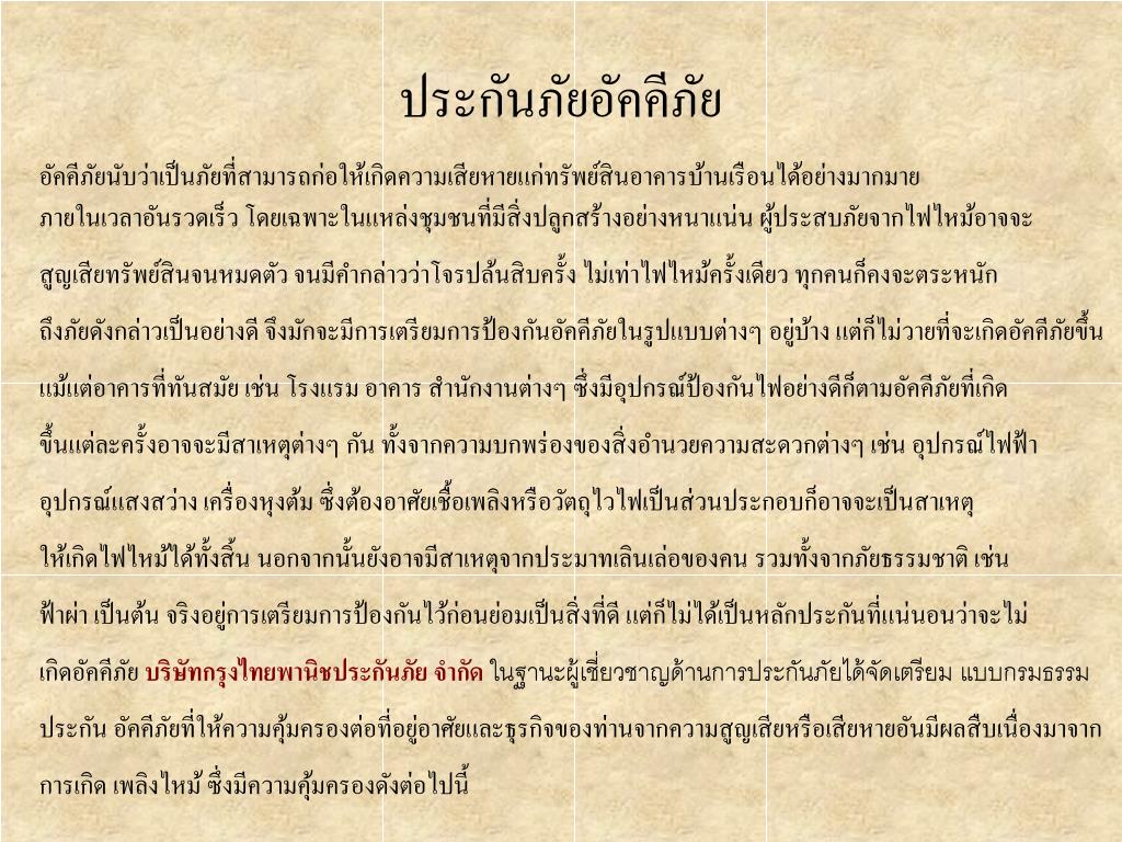 ประกันภัยอัคคีภัย อัคคีภัยนับว่าเป็นภัยที่สามารถก่อให้เกิดความเสียหายแก่ทรัพย์สินอาคารบ้านเรือนได้อย่างมากมายภายในเวลาอันรวดเร็ว โดยเฉพาะในแหล่งชุมชนที่มีสิ่งปลูกสร้างอย่างหนาแน่น ผู้ประสบภัยจากไฟไหม้อาจจะ สูญเสียทรัพย์สินจนหมดตัว จนมีคำกล่าวว่าโจรปล้นสิบครั้ง ไม่เท่าไฟไหม้ครั้งเดียว ทุกคนก็คงจะตระหนัก ถึงภัยดังกล่าวเป็นอย่างดี จึงมักจะมีการเตรียมการป้องกันอัคคีภัยในรูปแบบต่างๆ อยู่บ้าง แต่ก็ไม่วายที่จะเกิดอัคคีภัยขึ้น แม้แต่อาคารที่ทันสมัย เช่น โรงแรม อาคาร สำนักงานต่างๆ ซึ่งมีอุปกรณ์ป้องกันไฟอย่างดีก็ตามอัคคีภัยที่เกิด ขึ้นแต่ละครั้งอาจจะมีสาเหตุต่างๆ กัน ทั้งจากความบกพร่องของสิ่งอำนวยความสะดวกต่างๆ เช่น อุปกรณ์ไฟฟ้า อุปกรณ์แสงสว่าง เครื่องหุงต้ม ซึ่งต้องอาศัยเชื้อเพลิงหรือวัตถุไวไฟเป็นส่วนประกอบก็อาจจะเป็นสาเหตุ ให้เกิดไฟไหม้ได้ทั้งสิ้น นอกจากนั้นยังอาจมีสาเหตุจากประมาทเลินเล่อของคน รวมทั้งจากภัยธรรมชาติ เช่น ฟ้าผ่า เป็นต้น จริงอยู่การเตรียมการป้องกันไว้ก่อนย่อมเป็นสิ่งที่ดี แต่ก็ไม่ได้เป็นหลักประกันที่แน่นอนว่าจะไม่ เกิดอัคคีภัย บริษัทกรุงไทยพานิชประกันภัย จำกัด ในฐานะผู้เชี่ยวชาญด้านการประกันภัยได้จัดเตรียม แบบกรมธรรม ประกัน อัคคีภัยที่ให้ความคุ้มครองต่อที่อยู่อาศัยและธุรกิจของท่านจากความสูญเสียหรือเสียหายอันมีผลสืบเนื่องมาจาก การเกิด เพลิงไหม้ ซึ่งมีความคุ้มครองดังต่อไปนี้
