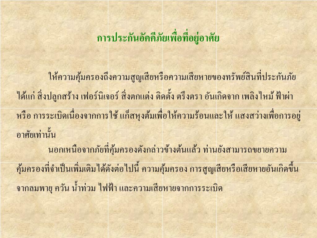 การประกันอัคคีภัยเพื่อที่อยู่อาศัยการประกันอัคคีภัยเพื่อที่อยู่อาศัย ให้ความคุ้มครองถึงความสูญเสียหรือความเสียหายของทรัพย์สินที่ประกันภัย ได้แก่ สิ่งปลูกสร้าง เฟอร์นิเจอร์ สิ่งตกแต่ง ติดตั้ง ตรึงตรา อันเกิดจาก เพลิงไหม้ ฟ้าผ่า หรือ การระเบิดเนื่องจากการใช้ แก็สหุงต้มเพื่อให้ความร้อนและให้ แสงสว่างเพื่อการอยู่ อาศัยเท่านั้น นอกเหนือจากภัยที่คุ้มครองดังกล่าวข้างต้นแล้ว ท่านยังสามารถขยายความ คุ้มครองที่จำเป็นเพิ่มเติมได้ดังต่อไปนี้ ความคุ้มครอง การสูญเสียหรือเสียหายอันเกิดขึ้น จากลมพายุ ควัน น้ำท่วม ไฟฟ้า และความเสียหายจากการระเบิด