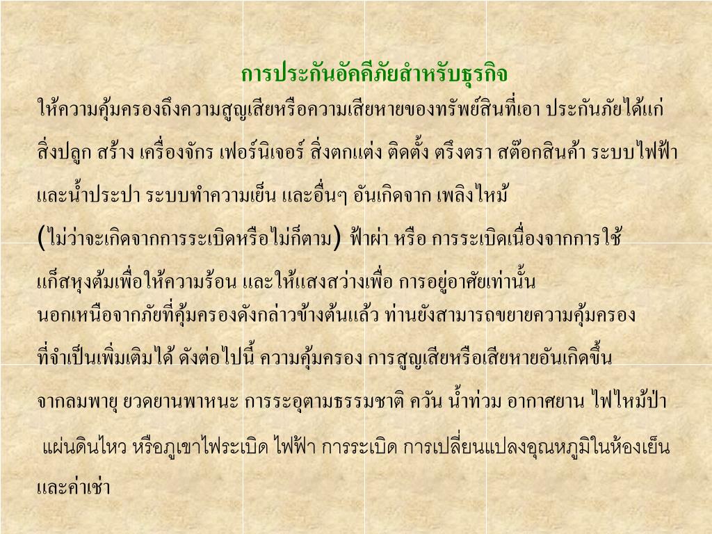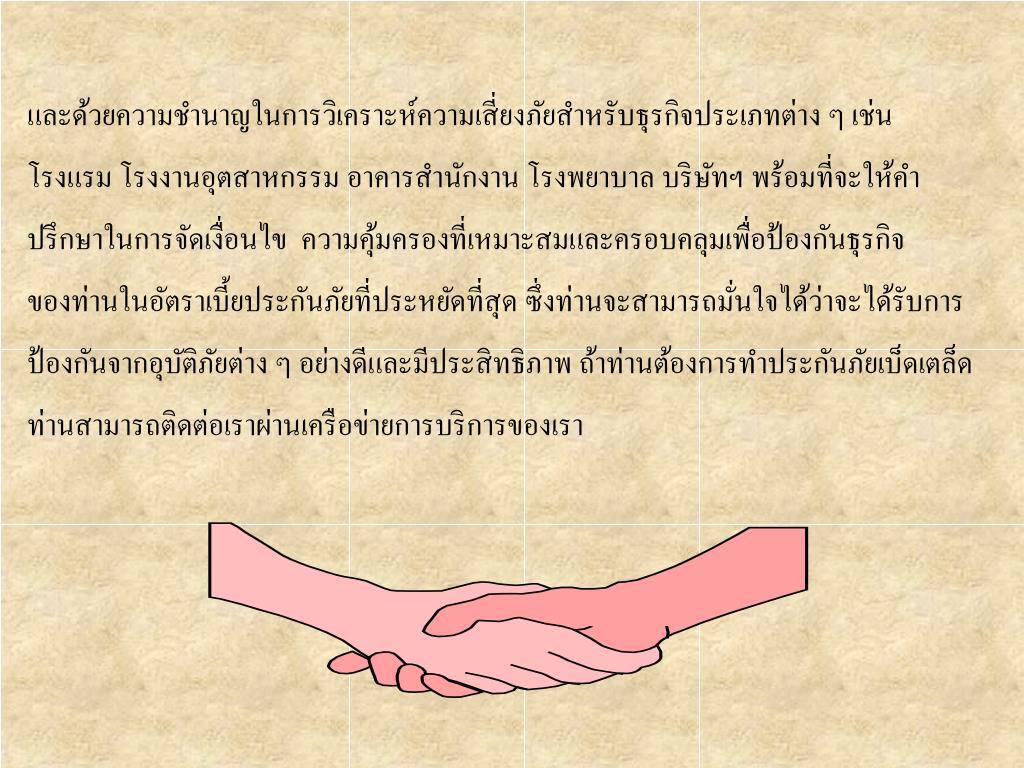 และด้วยความชำนาญในการวิเคราะห์ความเสี่ยงภัยสำหรับธุรกิจประเภทต่าง ๆ เช่น โรงแรม โรงงานอุตสาหกรรม อาคารสำนักงาน โรงพยาบาล บริษัทฯ พร้อมที่จะให้คำ ปรึกษาในการจัดเงื่อนไข ความคุ้มครองที่เหมาะสมและครอบคลุมเพื่อป้องกันธุรกิจ ของท่านในอัตราเบี้ยประกันภัยที่ประหยัดที่สุด ซึ่งท่านจะสามารถมั่นใจได้ว่าจะได้รับการ ป้องกันจากอุบัติภัยต่าง ๆ อย่างดีและมีประสิทธิภาพ ถ้าท่านต้องการทำประกันภัยเบ็ดเตล็ด ท่านสามารถติดต่อเราผ่านเครือข่ายการบริการของเรา