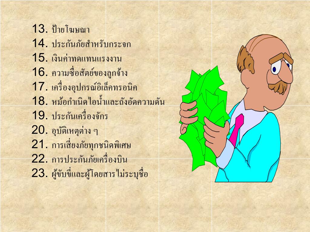13. ป้ายโฆษณา 14. ประกันภัยสำหรับกระจก 15. เงินค่าทดแทนแรงงาน 16. ความซื่อสัตย์ของลูกจ้าง 17. เครื่องอุปกรณ์อิเล็คทรอนิค18. หม้อกำเนิดไอน้ำและถังอัดความดัน 19. ประกันเครื่องจักร 20. อุบัติเหตุต่าง ๆ21. การเสี่ยงภัยทุกชนิดพิเศษ 22. การประกันภัยเครื่องบิน 23. ผู้ขับขี่และผู้โดยสารไม่ระบุชื่อ