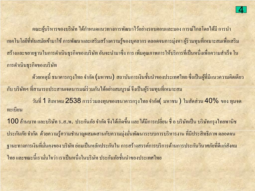 4 คณะผู้บริหารของบริษัท ได้กำหนดแนวทางการพัฒนาไว้อย่างรอบคอบและมอง การณ์ไกลโดยได้มี การนำ เทคโนโลยีที่ทันสมัยเข้ามาใช้ การพัฒนาและเสริมสร้างความรู้ของบุคลากร ตลอดจนการมุ่งหา ผู้ร่วมทุนที่เหมาะสมเพื่อเสริม สร้างและขยายฐานในการดำเนินธุรกิจของบริษัท อันจะนำมาซึ่ง การ เพิ่มคุณภาพการให้บริการที่เป็นหนึ่งเพื่อความสำเร็จ ใน การดำเนินธุรกิจของบริษัท ด้วยเหตุนี้ ธนาคารกรุงไทย จำกัด (มหาชน) สถาบันการเงินชั้นนำของประเทศไทย ซึ่งเป็นผู้ที่มีแนวความคิดเดียว กับ บริษัทฯ ที่สามารถประสานเจตนารมณ์ร่วมกันได้อย่างสมบูรณ์ จึงเป็นผู้ร่วมทุนที่เหมาะสม วันที่ 1 สิงหาคม 2538 การร่วมลงทุนของธนาคารกรุงไทย จำกัด( มหาชน ) ในสัดส่วน 40% ของ ทุนจดทะเบียน 100 ล้านบาท และบริษัท ร.ส.พ. ประกันภัย จำกัด จึงได้เกิดขึ้น และได้มีการเปลี่ยน ชื่ อ บริษัทเป็น บริษัทกรุงไทยพานิช ประกันภัย จำกัด ด้วยความรู้ความชำนาญผสมผสานกับความมุ่งมั่นพัฒนาระบบการบริหารงาน ที่มีประสิทธิภาพ ตลอดจน ฐานะทางการเงินที่มั่นคงของ บริษัท ย่อมเป็นหลักประกันใน การสร้างสรรค์การบริการด้านการประกันวินาศภัยที่ดีแก่สังคม ไทย และขณะนี้เรามั่นใจว่า เราเป็นหนึ่งในบริษัท ประกันภัยชั้นนำของประเทศไทย