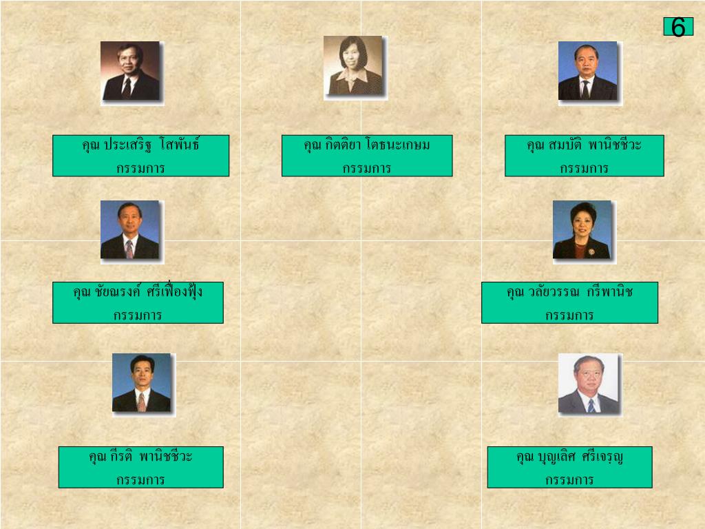 5 คณะกรรมการบริษัท คุณไพบูรณ์ พานิชชีวะ ประธานคณะกรรมการ คุณบุญทรง ศรีเฟื่องฟุ้ง ประธานกรรมการกิตติมศักดิ์ คุณ ศิรินทร์ นิมมานเหมินท์ รองประธานกรรมการ คุณเดช บุญ-หลง กรรมการ คุณ ชัยณรงค์ อินทรมีทรัพย์ กรรมการ คุณวัยชัย ธนิตติราภรณ์ กรรมการ