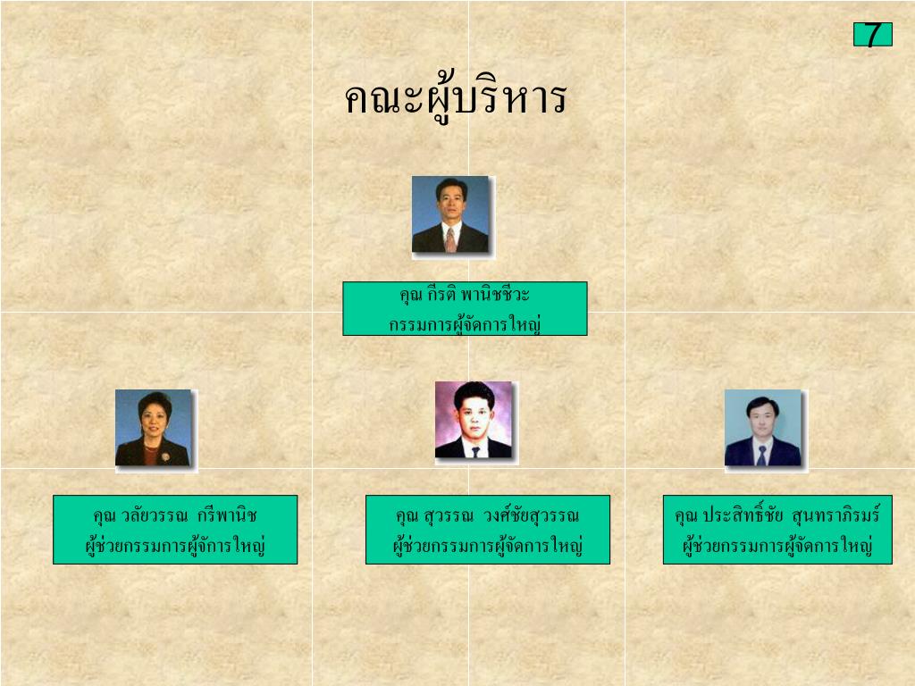 7 คณะผู้บริหาร คุณ กีรติ พานิชชีวะ กรรมการผู้จัดการใหญ่ คุณ วลัยวรรณ กรีพานิช ผู้ช่วยกรรมการผู้จัการใหญ่ คุณ สุวรรณ วงศ์ชัยสุวรรณ ผู้ช่วยกรรมการผู้จัดการใหญ่ คุณ ประสิทธิ์ชัย สุนทราภิรมร์ ผู้ช่วยกรรมการผู้จัดการใหญ่