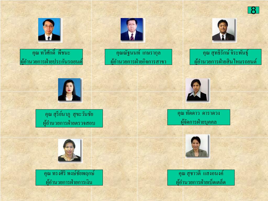 8 คุณ ทวีศักดิ์ พืชนะ ผู้อำนวยการฝ่ายประกันรถยนต์ คุณณัฐนนท์ เกษรากุล ผู้อำนวยการฝ่ายกิจการสาขา คุณ สุทธิรักษ์ จิระพันธุ์ ผู้อำนวยการฝ่ายสินไหมรถยนต์ คุณ สุรีย์นาภู สุขะวันชัย ผู้อำนวยการฝ่ายตรวจสอบ คุณ ทัดดาว ดาราดวง ผู้จัดการฝ่ายบุคคล คุณ ทรงศิริ พงษ์ชัยพฤกษ์ ผู้อำนวยการฝ่ายการเงิน คุณ สุชาวดี แสงอนงค์ ผู้อำนวยการฝ่ายเบ็ดเตล็ด