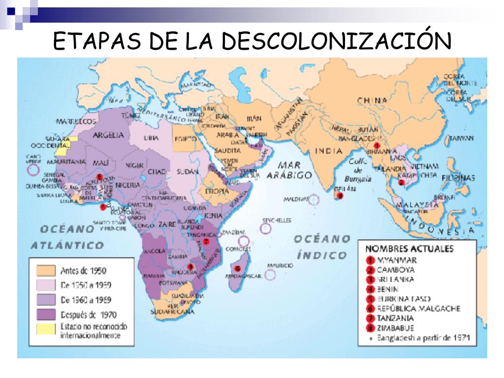 EL FIN DEL COLONIALISMO • Finalizada la Segunda Guerra Mundial se inicia un proceso conocido como descolonización. • Este proceso se extendió hasta la década de 1970 y consiste en que los antiguos territorios coloniales consiguen su independencia tras años de dominación extranjera. • Este proceso fue posible gracias al debilitamiento de las potencias luego de la guerra y la creación de la ONU que defendía la independencia de los pueblos.
