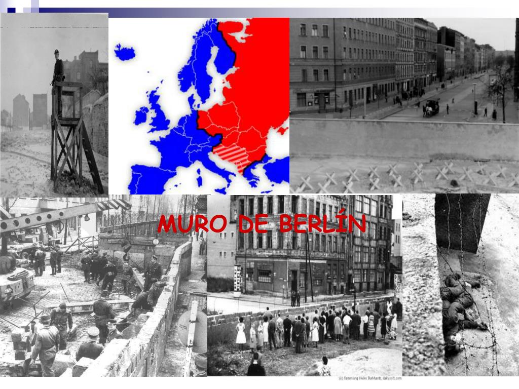 PRINCIPALES CONFLICTOS LA DIVISIÓN DE ALEMANIA (1949) • Fue el primer conflicto entre la URSS y los países occidentales. • A partir de 1947, Francia, Inglaterra y Estados Unidos, iniciaron la unificación de los territorios alemanes bajo su control, dejándolas separadas de la zona soviética. • La reacción rusa fue cerrar los accesos terrestres a Berlín, aislando la zona soviética. A lo que Estados Unidos respondió con un puente aéreo para abastecer la ciudad. • Después de un año, los soviéticos terminaron con el bloqueo pero Alemania quedó dividida. • En 1949, Alemania se dividió en dos países: la República Democrática Alemana (RDA), bajo control soviético, y la República Federal Alemana (RFA), bajo control de las democracias occidentales. • Berlín, la capital también fue dividida.