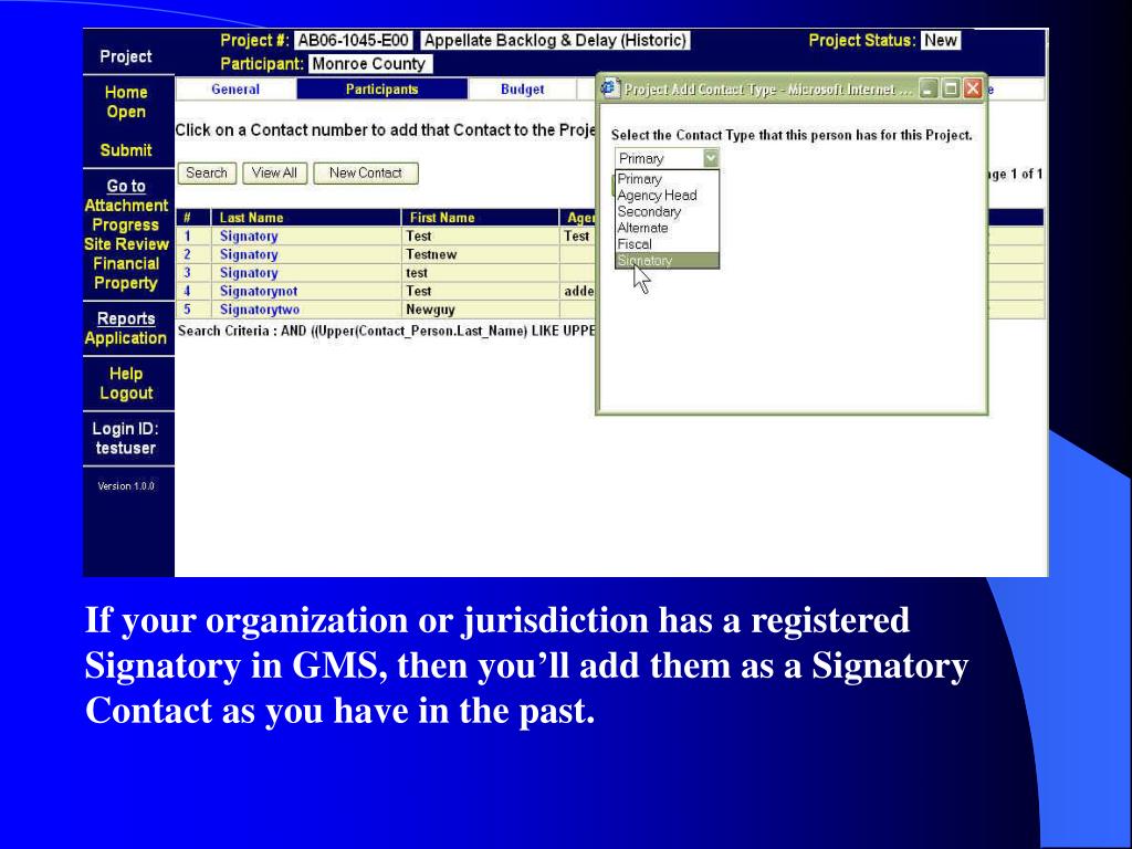 If your organization or jurisdiction has a registered Signatory in GMS, then you’ll add them as a Signatory Contact as you have in the past.