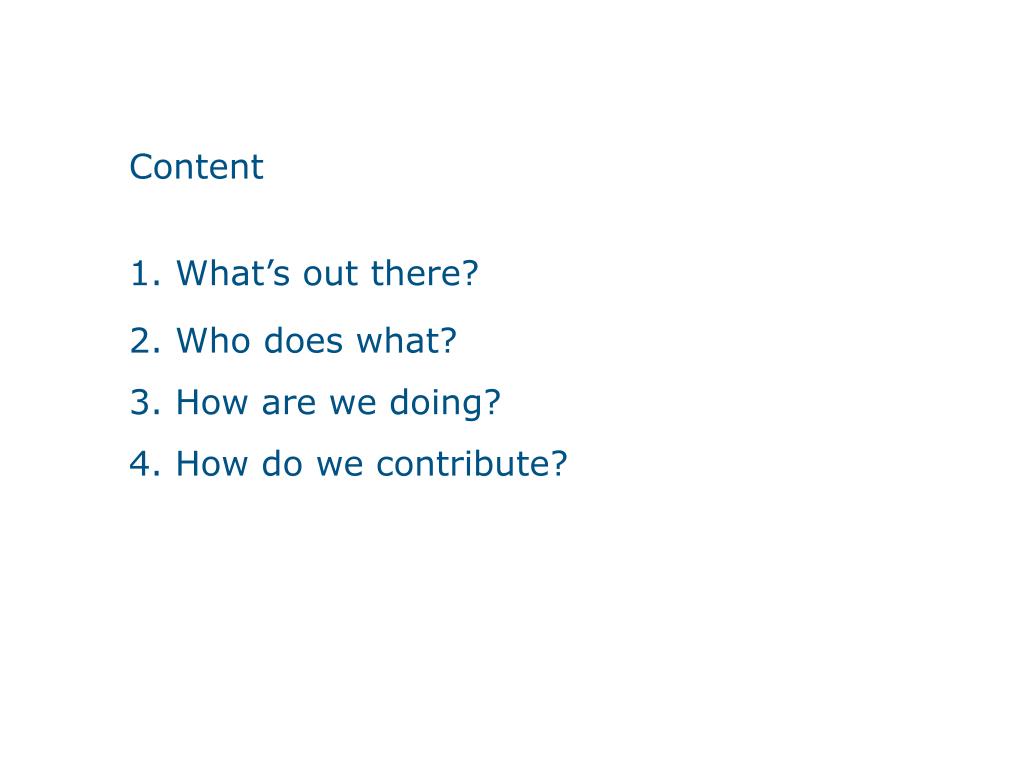 Content 1. What’s out there? 2. Who does what? 3. How are we doing? 4. How do we contribute?