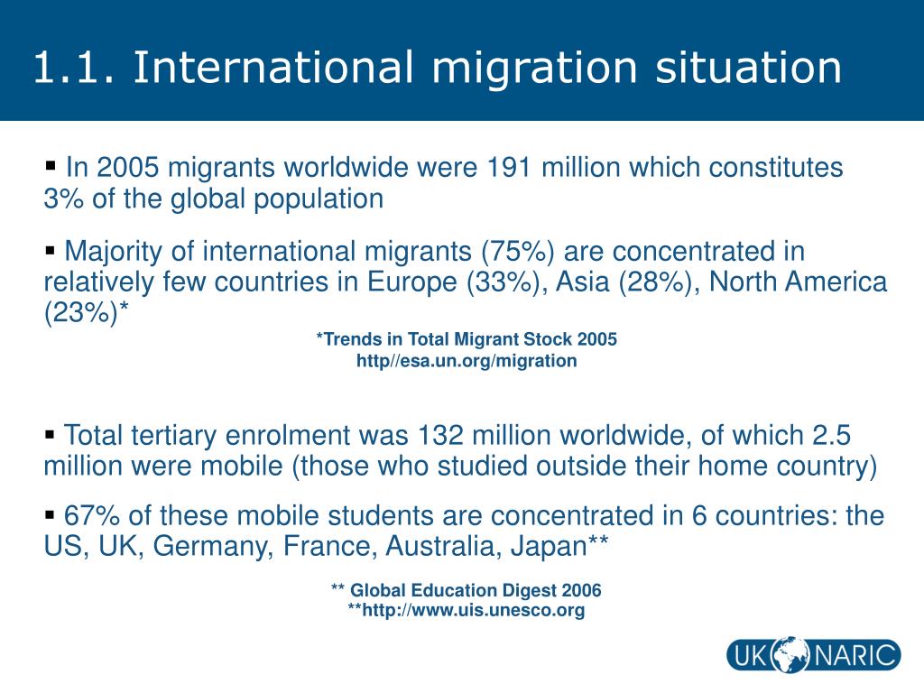 1.1. International migration situation • In 2005 migrants worldwide were 191 million which constitutes 3% of the global population • Majority of international migrants (75%) are concentrated in relatively few countries in Europe (33%), Asia (28%), North America (23%)* • *Trends in Total Migrant Stock 2005 • http//esa.un.org/migration • Total tertiary enrolment was 132 million worldwide, of which 2.5 million were mobile (those who studied outside their home country) • 67% of these mobile students are concentrated in 6 countries: the US, UK, Germany, France, Australia, Japan** ** Global Education Digest 2006 **http://www.uis.unesco.org