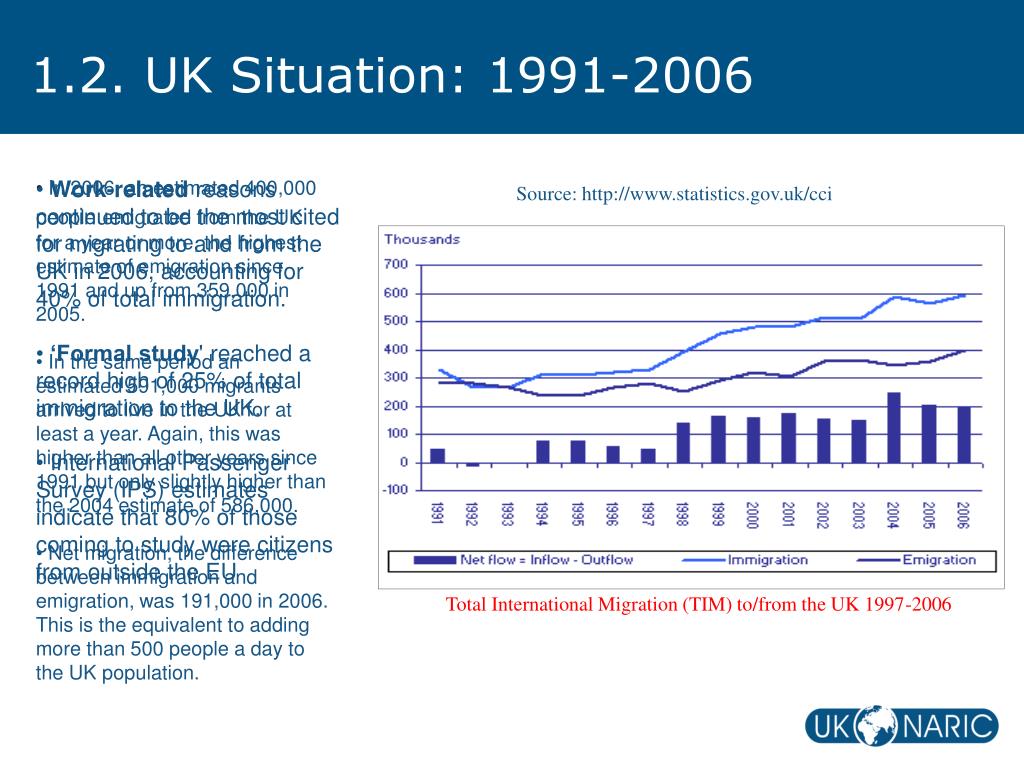 1.2. UK Situation: 1991-2006 • Work-related reasons continued to be the most cited for migrating to and from the UK in 2006, accounting for 40% of total immigration. • ‘Formal study' reached a record high of 25% of total immigration to the UK. • International Passenger Survey (IPS) estimates indicate that 80% of those coming to study were citizens from outside the EU • In 2006, an estimated 400,000 peopleemigrated from the UK for a year or more, the highest estimate of emigration since 1991 and up from 359,000 in 2005. • In the same period an estimated 591,000 migrants arrived to live in the UK for at least a year. Again, this was higher than all other years since 1991 but only slightly higher than the 2004 estimate of 586,000. • Net migration, the difference between immigration and emigration, was 191,000 in 2006. This is the equivalent to adding more than 500 people a day to the UK population. Source: http://www.statistics.gov.uk/cci Total International Migration (TIM) to/from the UK 1997-2006