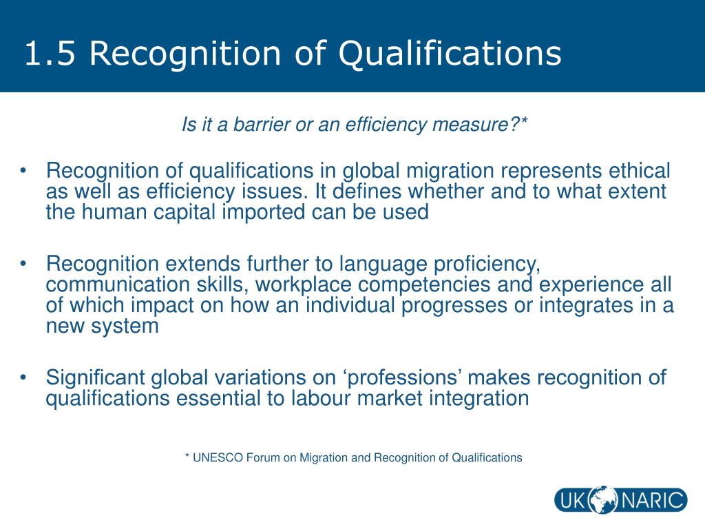 1.5 Recognition of Qualifications Is it a barrier or an efficiency measure?* • Recognition of qualifications in global migration represents ethical as well as efficiency issues. It defines whether and to what extent the human capital imported can be used • Recognition extends further to language proficiency, communication skills, workplace competencies and experience all of which impact on how an individual progresses or integrates in a new system • Significant global variations on ‘professions’ makes recognition of qualifications essential to labour market integration * UNESCO Forum on Migration and Recognition of Qualifications
