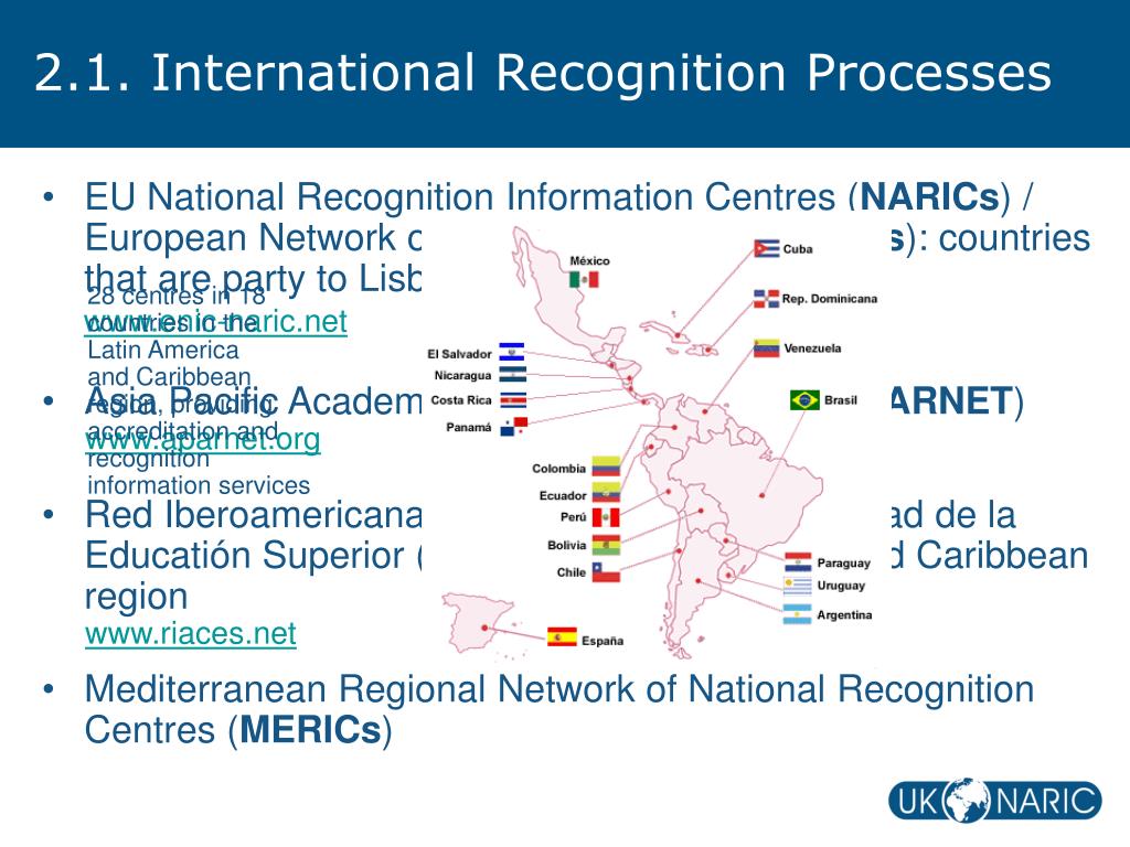 2.1. International Recognition Processes 28 centres in 18 countries in the Latin America and Caribbean region, providing accreditation and recognition information services • EU National Recognition Information Centres (NARICs) / European Network of Information centres (ENICs): countries that are party to Lisbon Recognition Convention) www.enic-naric.net • Asia Pacific Academic Recognition Network (APARNET) www.aparnet.org • Red Iberoamericana de Acreditación de la Calidad de la Educatión Superior (RIACES): Latin America and Caribbean region www.riaces.net • Mediterranean Regional Network of National Recognition Centres (MERICs)