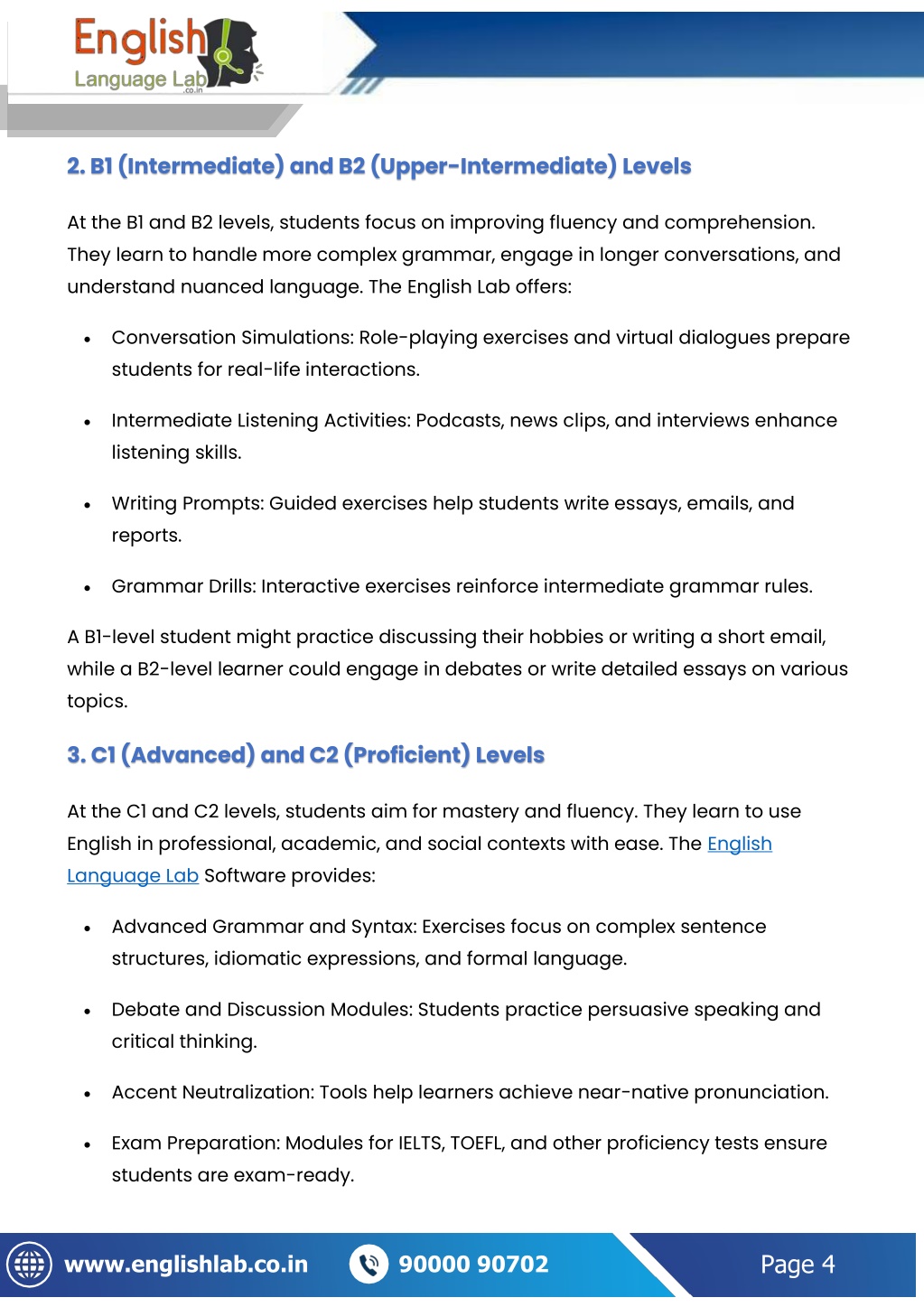 1. A1 (Beginner) and A2 (Elementary) Levels At the A1 and A2 levels, students are introduced to the basics of English. They learn simple phrases, basic grammar, and essential vocabulary. The English Lab supports beginners by providing: •Interactive Vocabulary Builders: Tools like flashcards, word games, and visual aids help students learn English Vocabulary in a fun and engaging way. •Pronunciation Practice: Speech recognition technology helps learners master basic pronunciation and intonation. •Basic Listening Exercises: Simple audio clips and dialogues improve listening comprehension. •Guided Speaking Activities: Students practice forming simple sentences and engaging in basic conversations. Page 3 For example, an A1-level student might start by learning greetings and common phrases, while an A2-level learner progresses to describing daily routines and expressing simple opinions. www.englishlab.co.in / 90000 90702