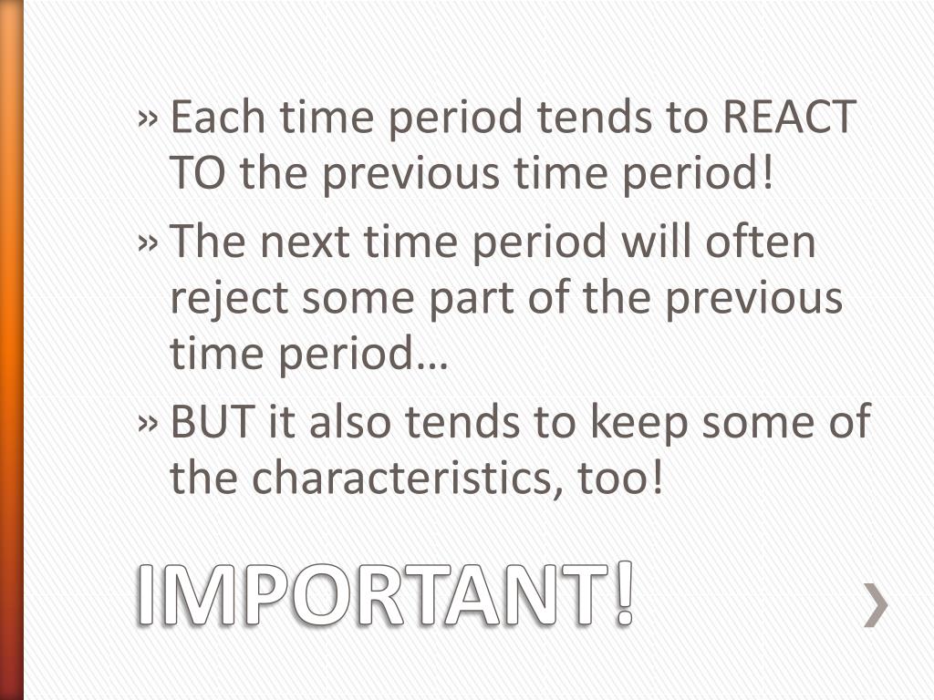 Each time period tends to REACT TO the previous time period! • The next time period will often reject some part of the previous time period… • BUT it also tends to keep some of the characteristics, too! IMPORTANT!