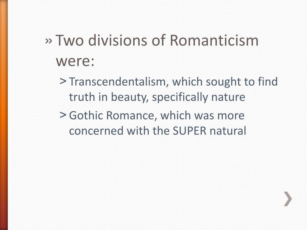 Two divisions of Romanticism were: • Transcendentalism, which sought to find truth in beauty, specifically nature • Gothic Romance, which was more concerned with the SUPER natural