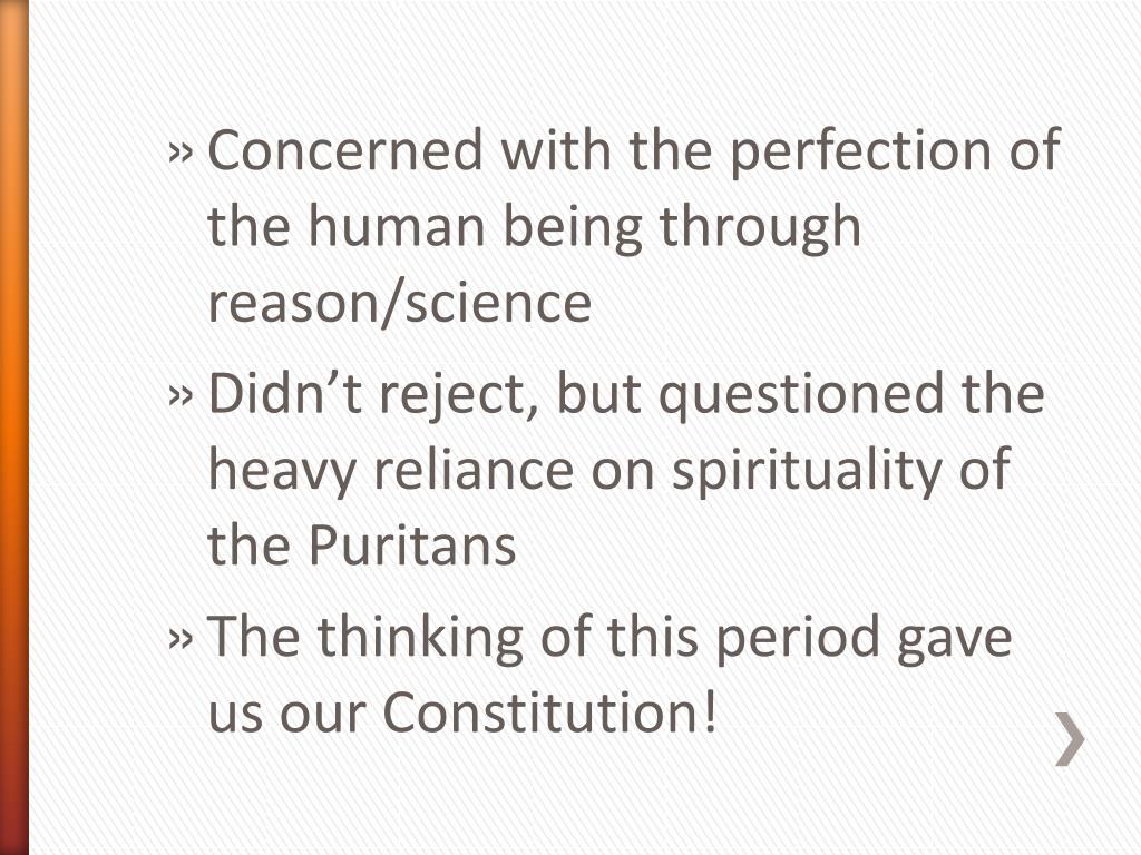 Concerned with the perfection of the human being through reason/science • Didn’t reject, but questioned the heavy reliance on spirituality of the Puritans • The thinking of this period gave us our Constitution!