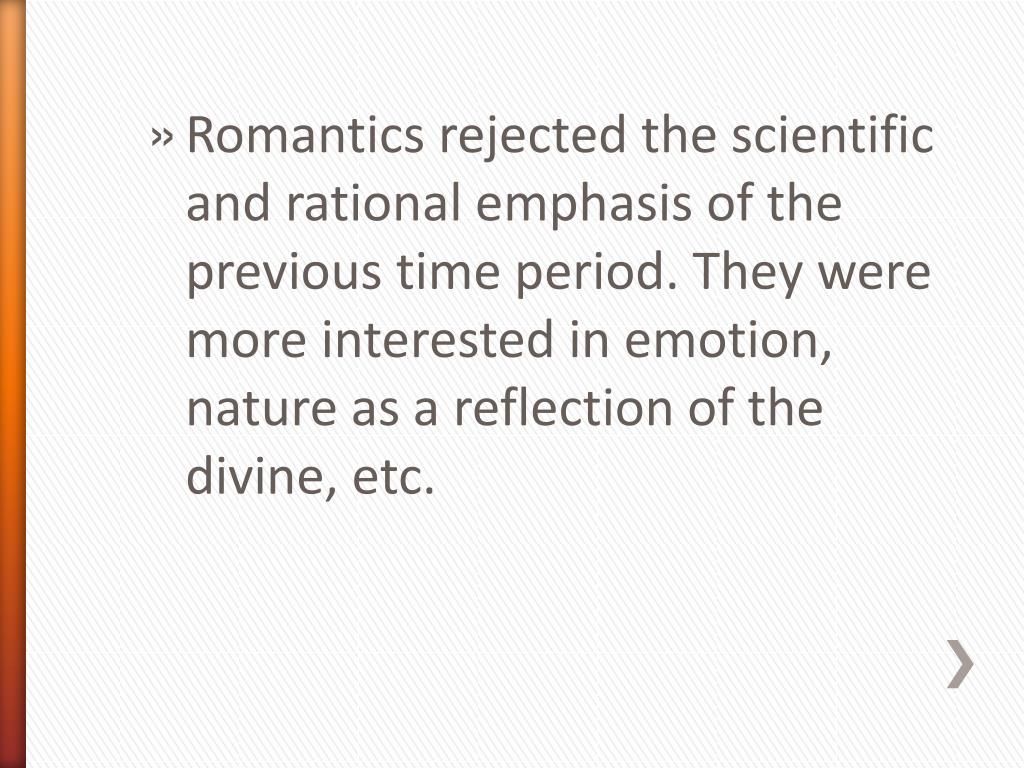 Romantics rejected the scientific and rational emphasis of the previous time period. They were more interested in emotion, nature as a reflection of the divine, etc.
