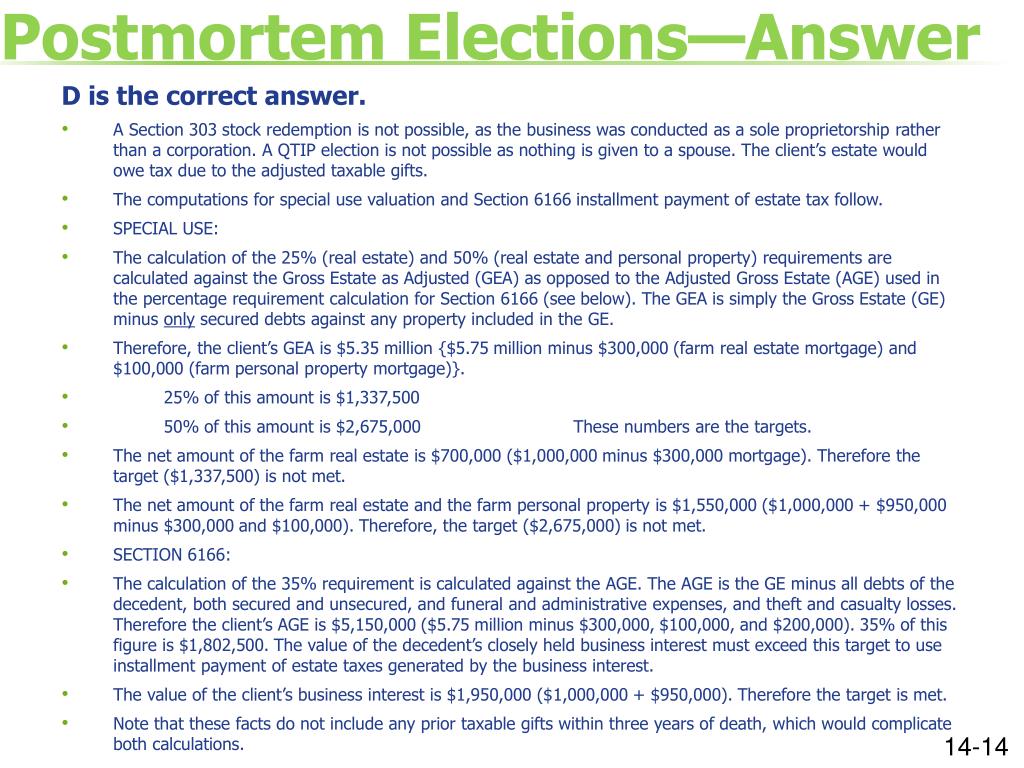Postmortem Elections—Answer D is the correct answer. • A Section 303 stock redemption is not possible, as the business was conducted as a sole proprietorship rather than a corporation. A QTIP election is not possible as nothing is given to a spouse. The client’s estate would owe tax due to the adjusted taxable gifts. • The computations for special use valuation and Section 6166 installment payment of estate tax follow. • SPECIAL USE: • The calculation of the 25% (real estate) and 50% (real estate and personal property) requirements are calculated against the Gross Estate as Adjusted (GEA) as opposed to the Adjusted Gross Estate (AGE) used in the percentage requirement calculation for Section 6166 (see below). The GEA is simply the Gross Estate (GE) minus only secured debts against any property included in the GE. • Therefore, the client’s GEA is $5.35 million {$5.75 million minus $300,000 (farm real estate mortgage) and $100,000 (farm personal property mortgage)}. • 25% of this amount is $1,337,500 • 50% of this amount is $2,675,000 These numbers are the targets. • The net amount of the farm real estate is $700,000 ($1,000,000 minus $300,000 mortgage). Therefore the target ($1,337,500) is not met. • The net amount of the farm real estate and the farm personal property is $1,550,000 ($1,000,000 + $950,000 minus $300,000 and $100,000). Therefore, the target ($2,675,000) is not met. • SECTION 6166: • The calculation of the 35% requirement is calculated against the AGE. The AGE is the GE minus all debts of the decedent, both secured and unsecured, and funeral and administrative expenses, and theft and casualty losses. Therefore the client’s AGE is $5,150,000 ($5.75 million minus $300,000, $100,000, and $200,000). 35% of this figure is $1,802,500. The value of the decedent’s closely held business interest must exceed this target to use installment payment of estate taxes generated by the business interest. • The value of the client’s business interest is $1,950,000 ($1,000,000 + $950,000). Therefore the target is met. • Note that these facts do not include any prior taxable gifts within three years of death, which would complicate both calculations.