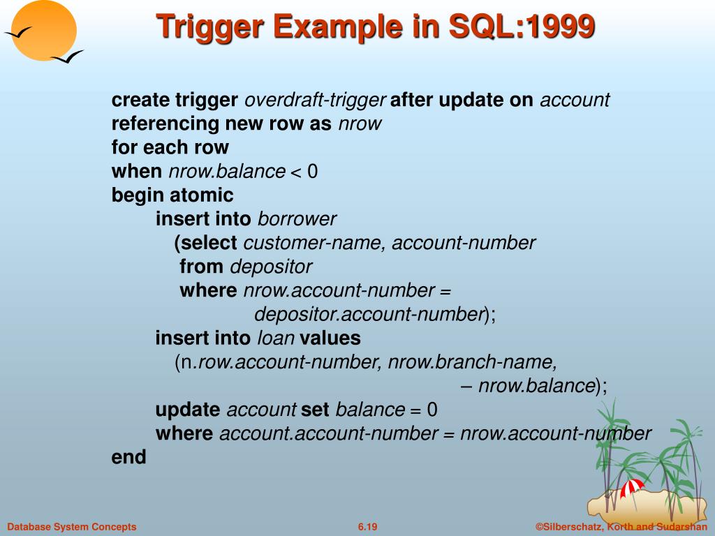 Trigger Example in SQL:1999 create trigger overdraft-trigger after update on account referencing new row as nrow for each rowwhen nrow.balance < 0begin atomic insert into borrower (select customer-name, account-number from depositor where nrow.account-number = depositor.account-number); insert into loan values (n.row.account-number, nrow.branch-name, – nrow.balance); update account set balance = 0 where account.account-number = nrow.account-numberend