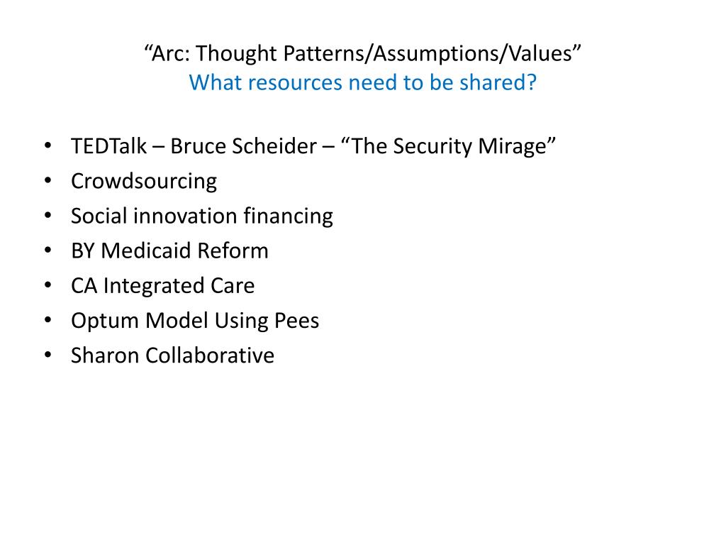 “Arc: Thought Patterns/Assumptions/Values”What resources need to be shared? • TEDTalk – Bruce Scheider – “The Security Mirage” • Crowdsourcing • Social innovation financing • BY Medicaid Reform • CA Integrated Care • Optum Model Using Pees • Sharon Collaborative