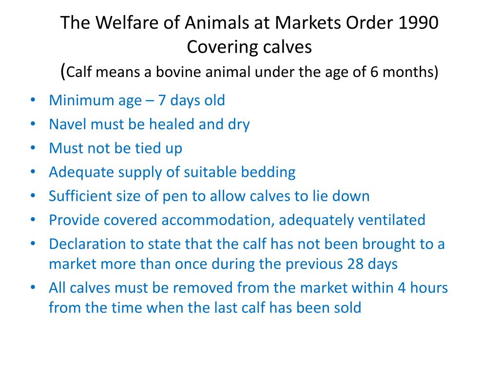 The Welfare of Animals at Markets Order 1990Covering calves(Calf means a bovine animal under the age of 6 months) • Minimum age – 7 days old • Navel must be healed and dry • Must not be tied up • Adequate supply of suitable bedding • Sufficient size of pen to allow calves to lie down • Provide covered accommodation, adequately ventilated • Declaration to state that the calf has not been brought to a market more than once during the previous 28 days • All calves must be removed from the market within 4 hours from the time when the last calf has been sold