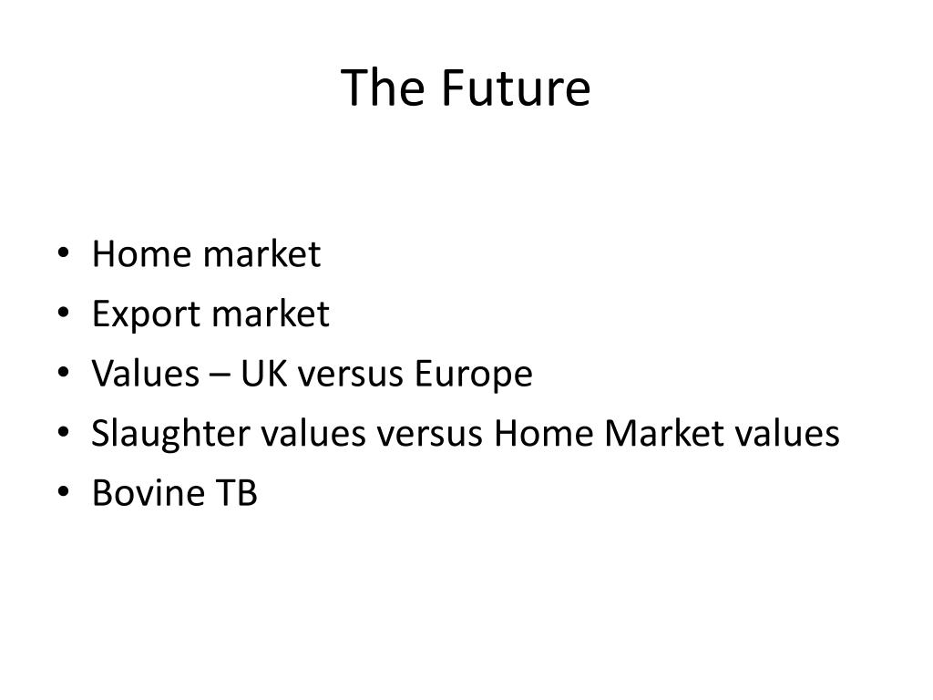 The Future • Home market • Export market • Values – UK versus Europe • Slaughter values versus Home Market values • Bovine TB