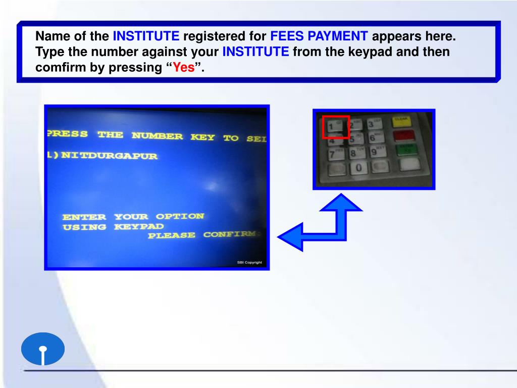 Name of the INSTITUTE registered for FEES PAYMENT appears here. Type the number against your INSTITUTE from the keypad and then comfirm by pressing “Yes”.