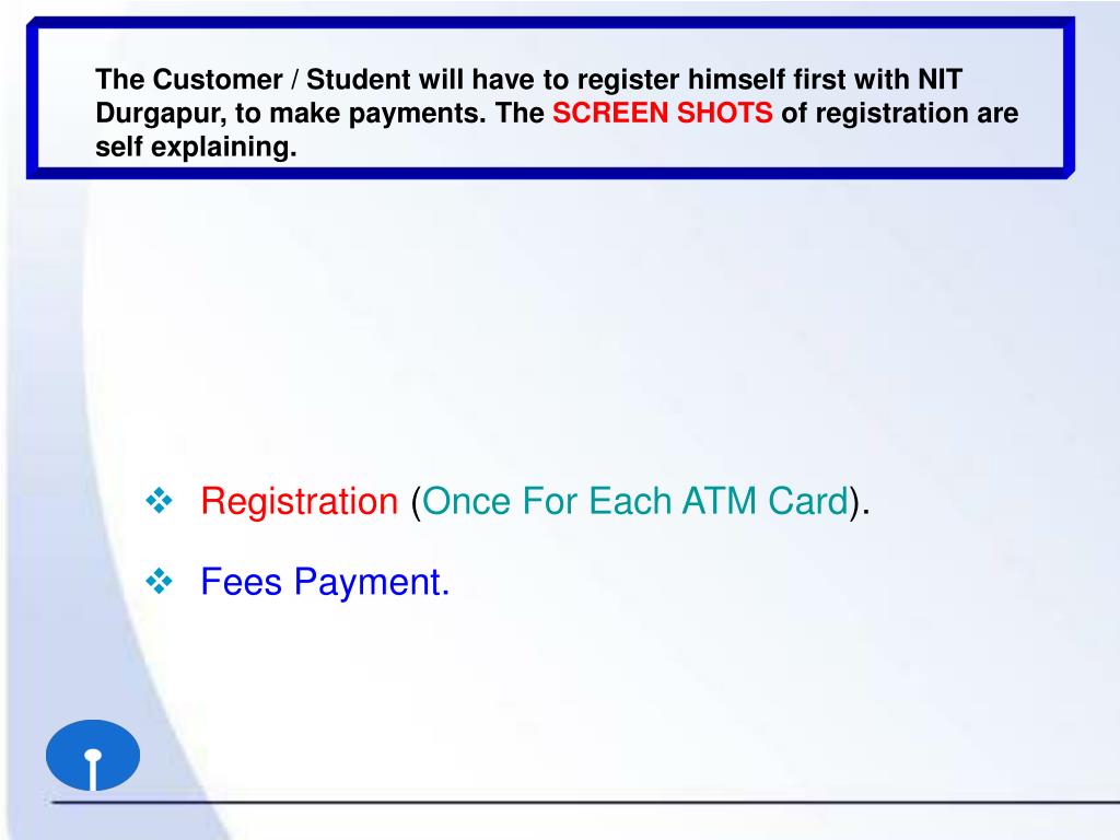 The Customer / Student will have to register himself first with NIT Durgapur, to make payments. The SCREEN SHOTS of registration are self explaining. • Registration (Once For Each ATM Card). • Fees Payment.