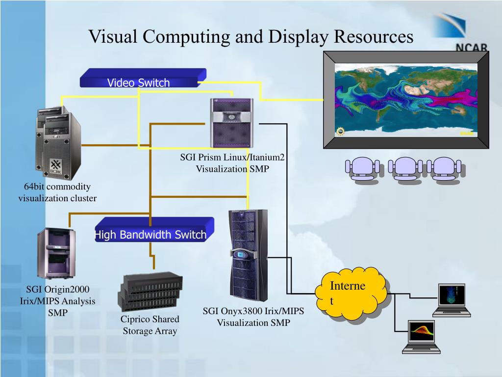 SGI Prism Linux/Itanium2 Visualization SMP 64bit commodity visualization cluster SGI Origin2000 Irix/MIPS Analysis SMP SGI Onyx3800 Irix/MIPS Visualization SMP Ciprico Shared Storage Array Visual Computing and Display Resources Video Switch High Bandwidth Switch Internet