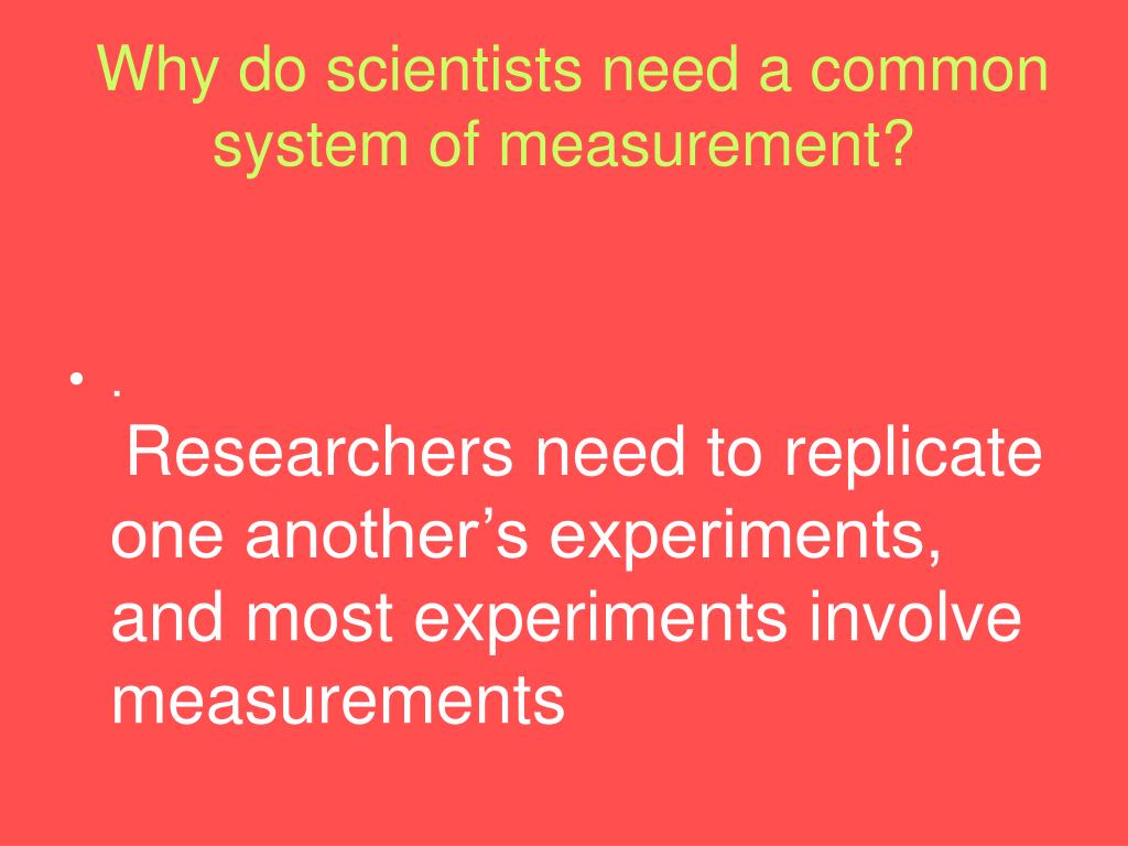 Why do scientists need a common system of measurement? • .Researchers need to replicate one another’s experiments, and most experiments involve measurements