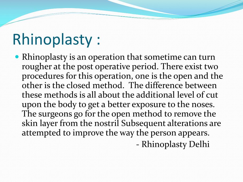 Rhinoplasty : • Rhinoplasty is an operation that sometime can turn rougher at the post operative period. There exist two procedures for this operation, one is the open and the other is the closed method. The difference between these methods is all about the additional level of cut upon the body to get a better exposure to the noses. The surgeons go for the open method to remove the skin layer from the nostril Subsequent alterations are attempted to improve the way the person appears. - RhinoplastyDelhi