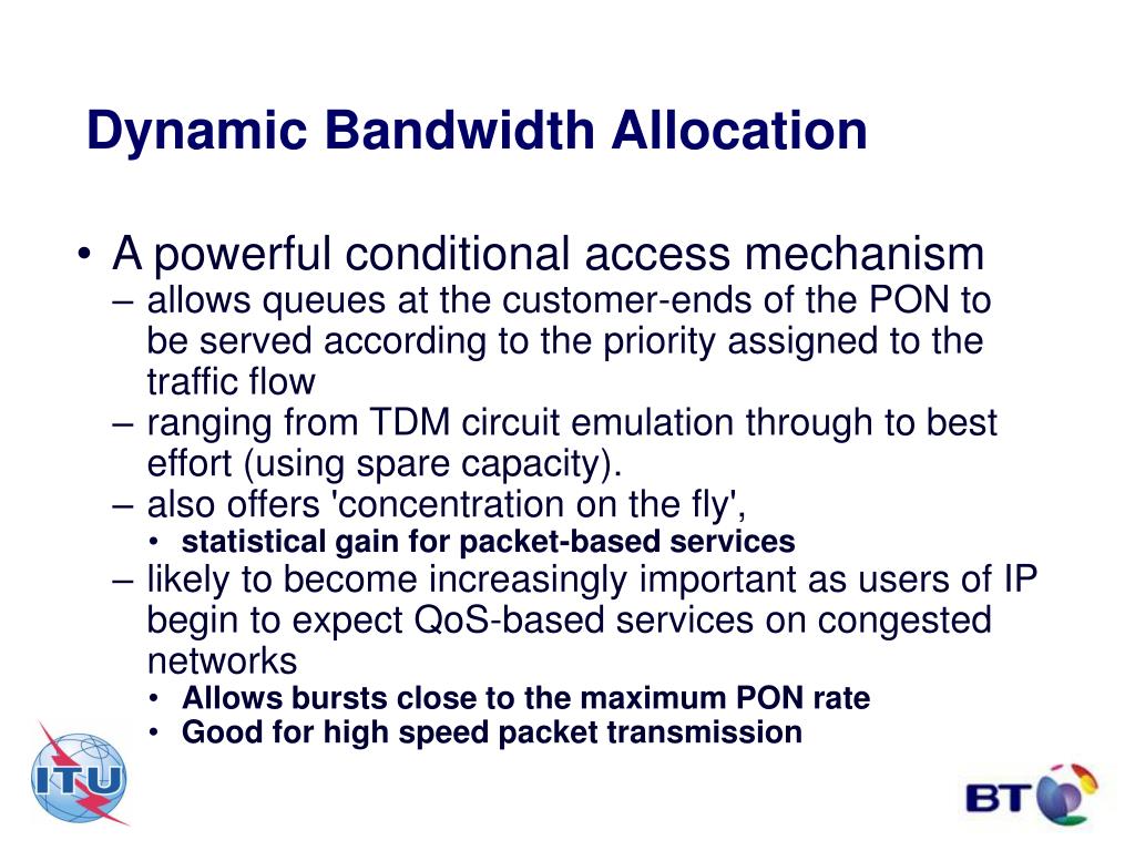 Dynamic Bandwidth Allocation • A powerful conditional access mechanism • allows queues at the customer-ends of the PON to be served according to the priority assigned to the traffic flow • ranging from TDM circuit emulation through to best effort (using spare capacity). • also offers 'concentration on the fly', • statistical gain for packet-based services • likely to become increasingly important as users of IP begin to expect QoS-based services on congested networks • Allows bursts close to the maximum PON rate • Good for high speed packet transmission